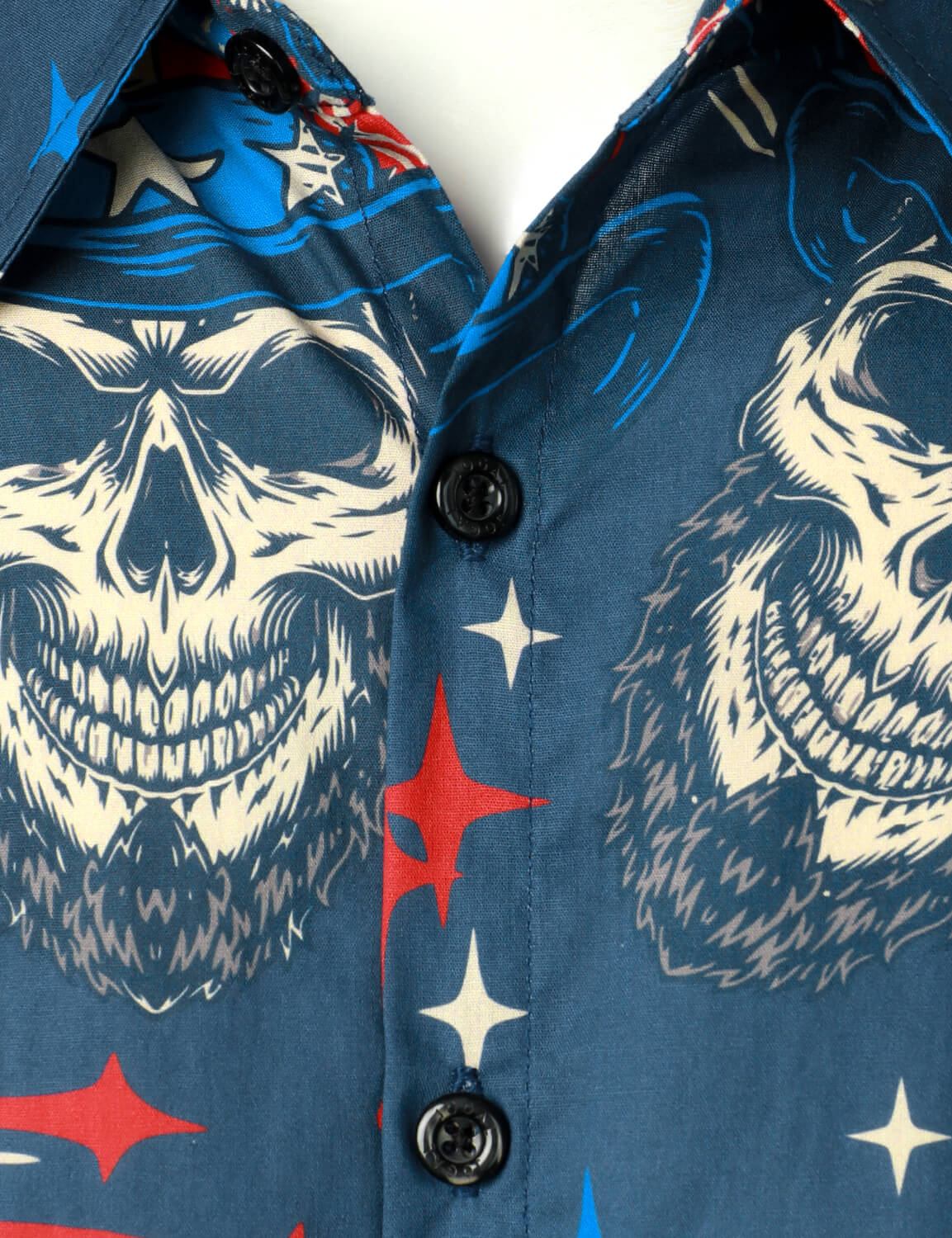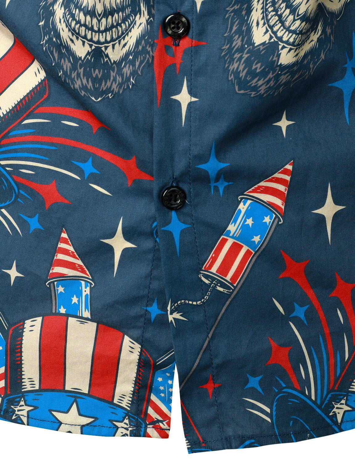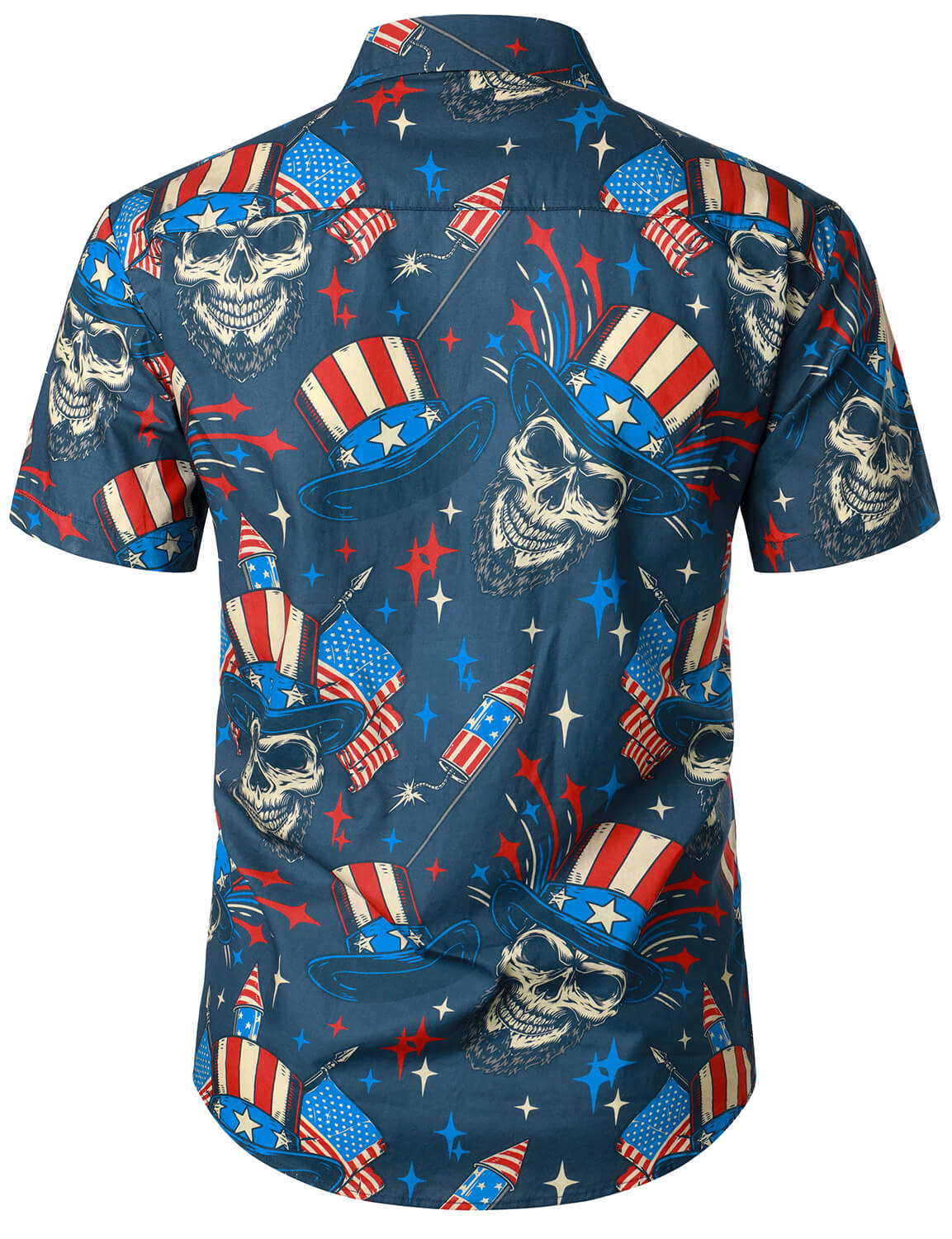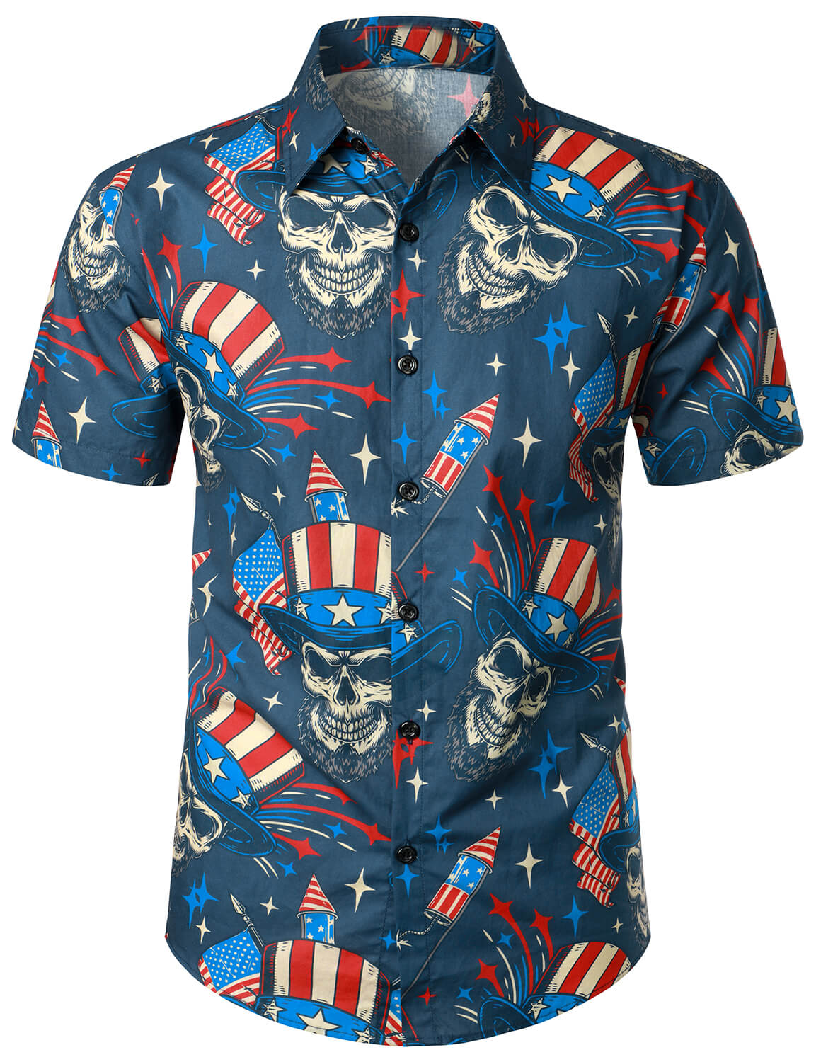 Marineblaues Hawaii-Hemd für Herren mit Totenkopf-Aufdruck amerikanische Flagge kurzärmelig geknöpft