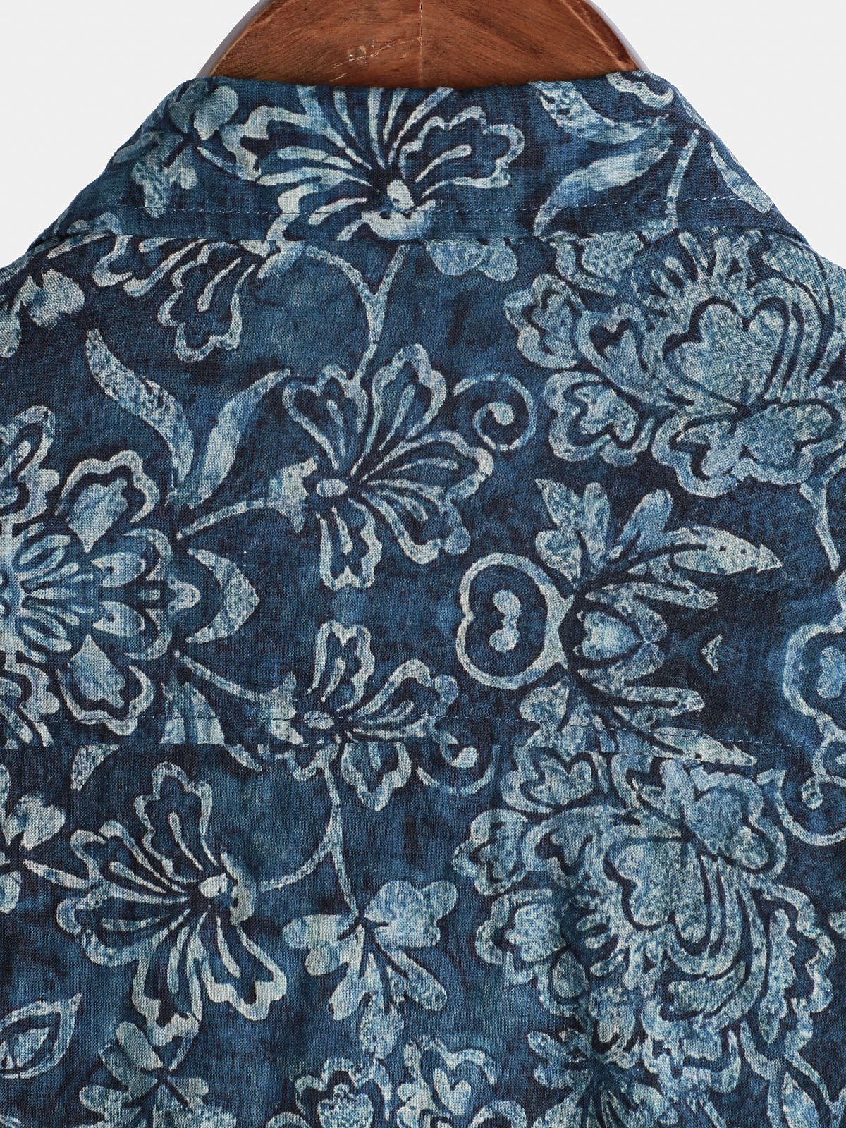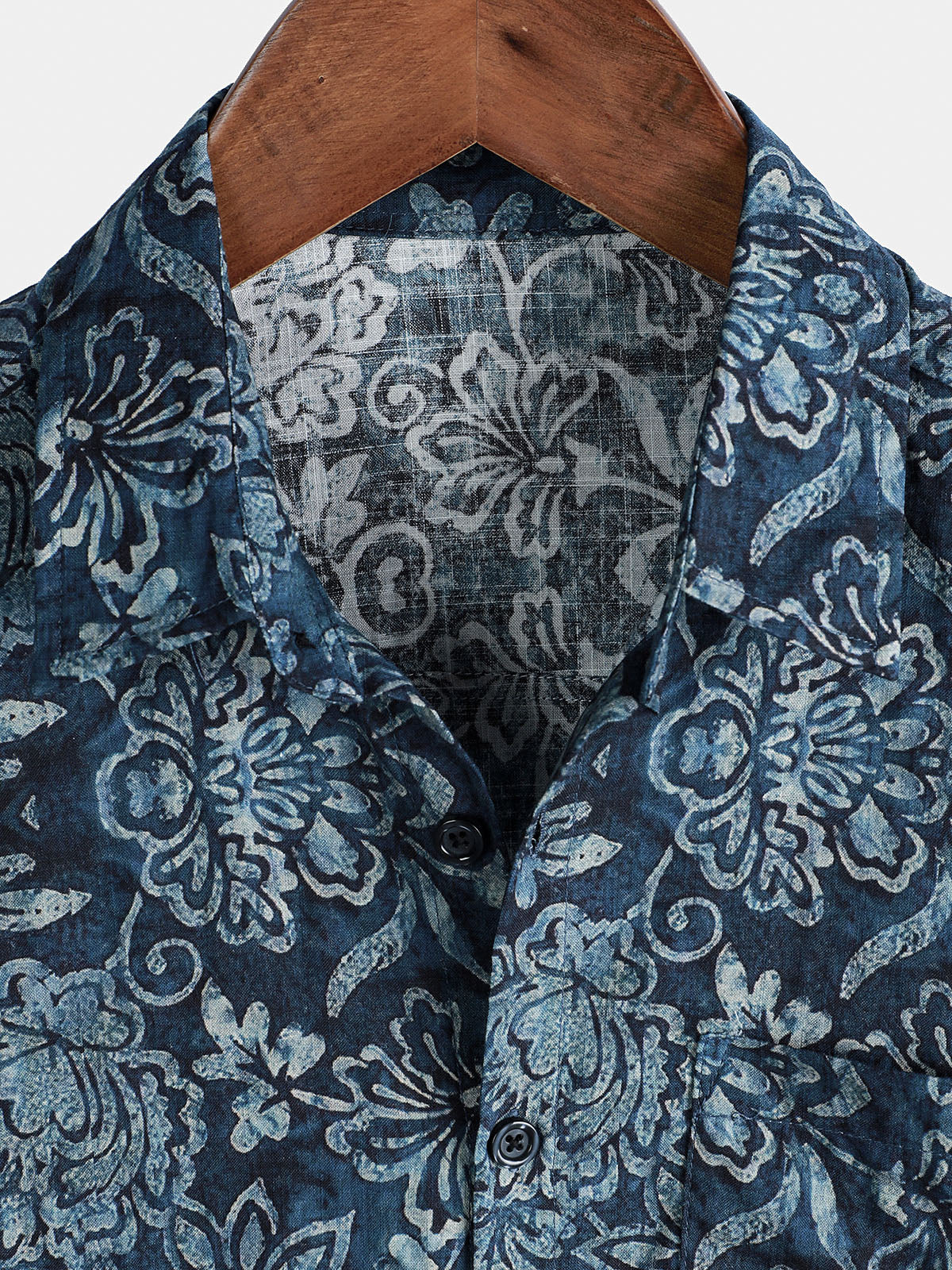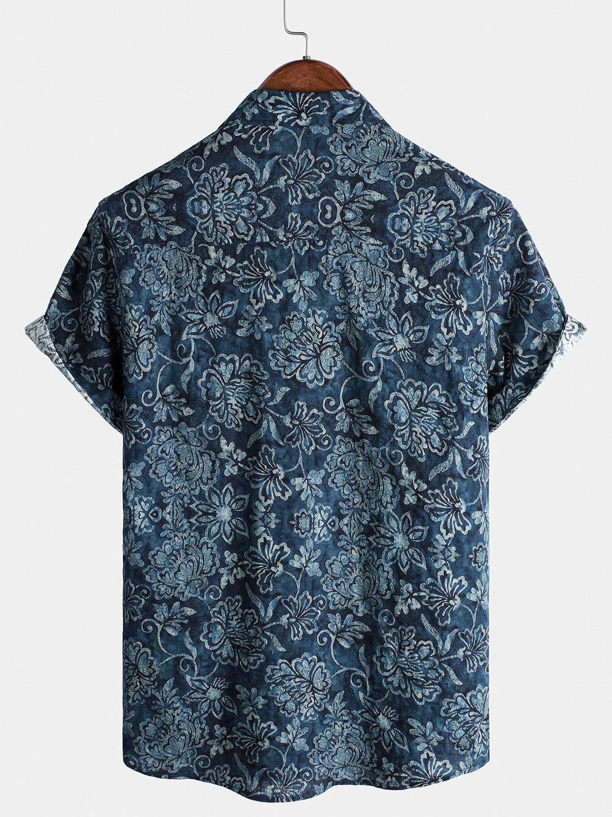Herren Kurzärmliges Blumenmuster Baumwolle Hawaiihemd Blau