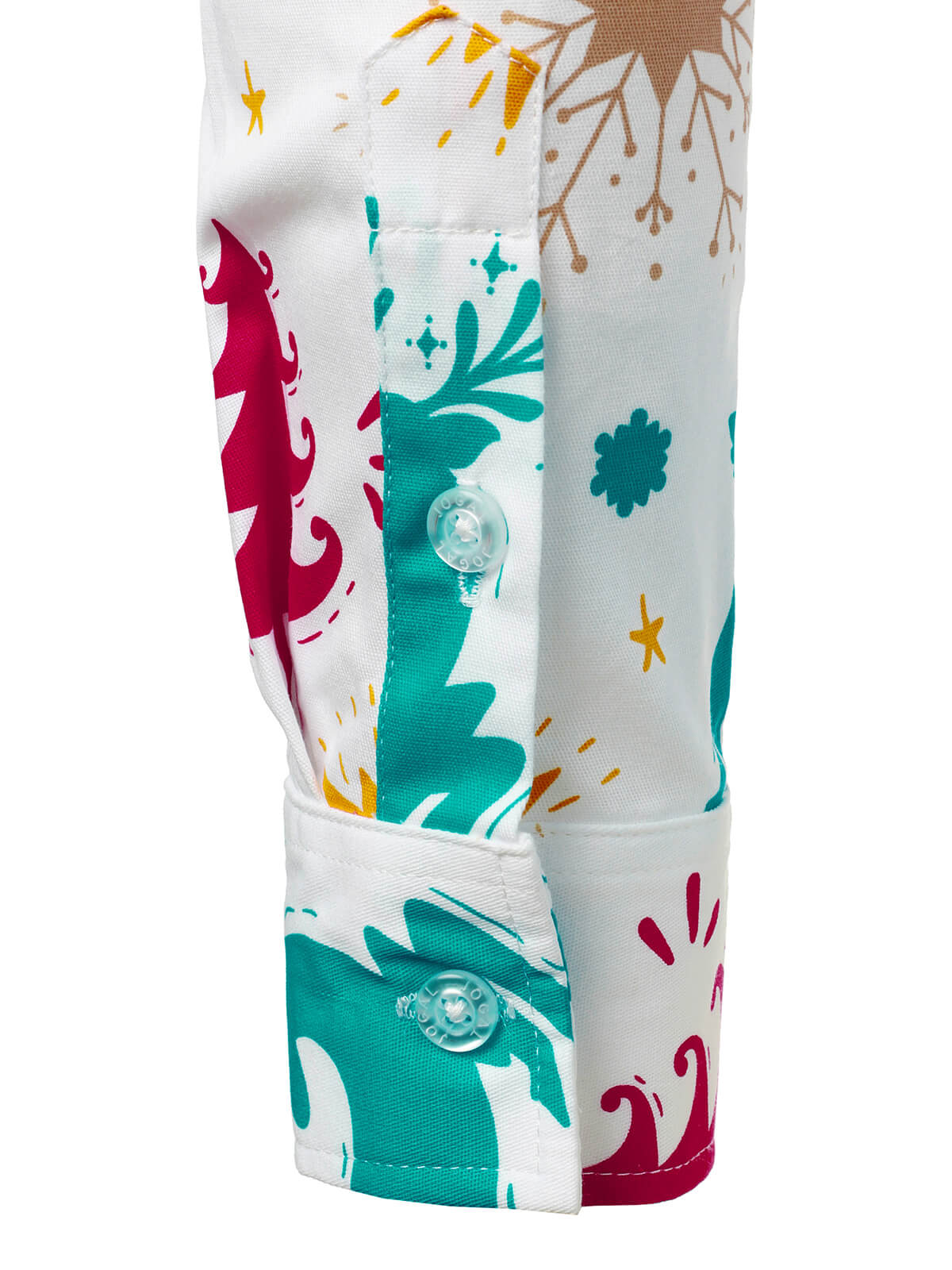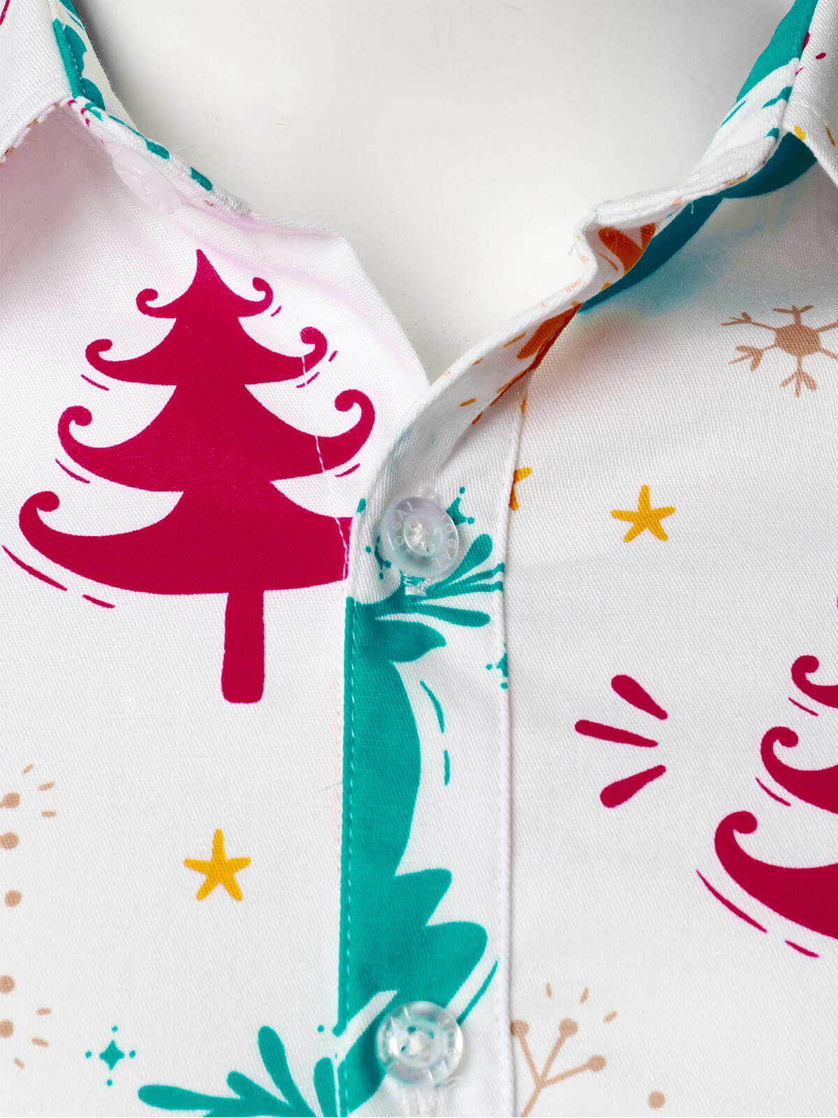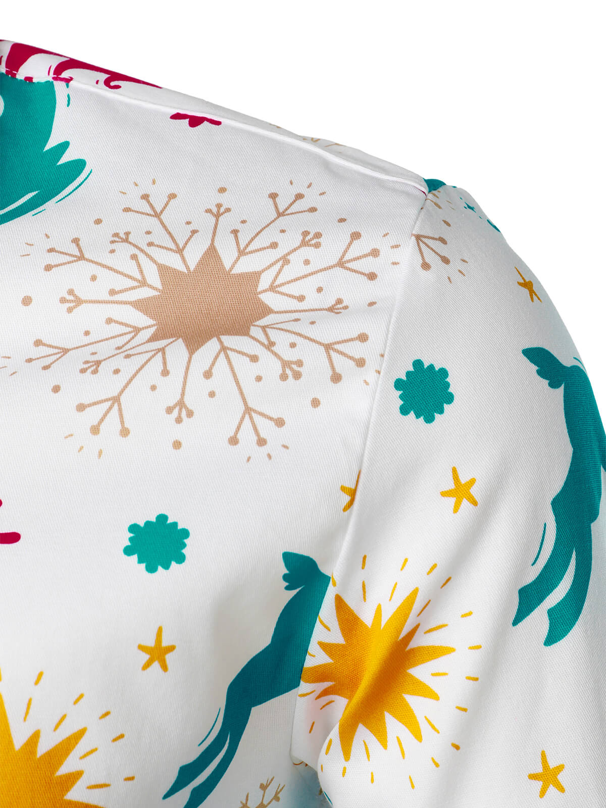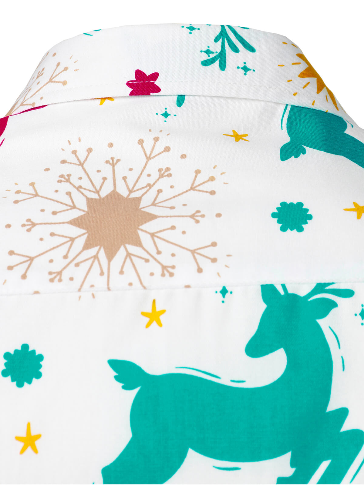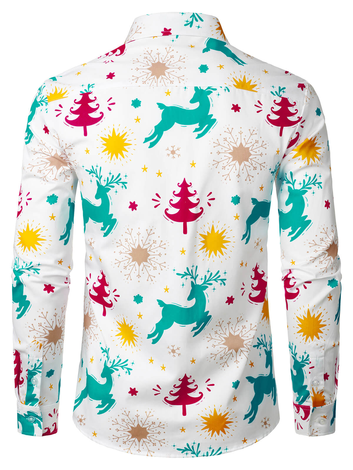 Herren weißes Weihnachts Hemd mit Druck von Waldtieren und Bäumen im Button-Up-Stil und langen Ärmeln