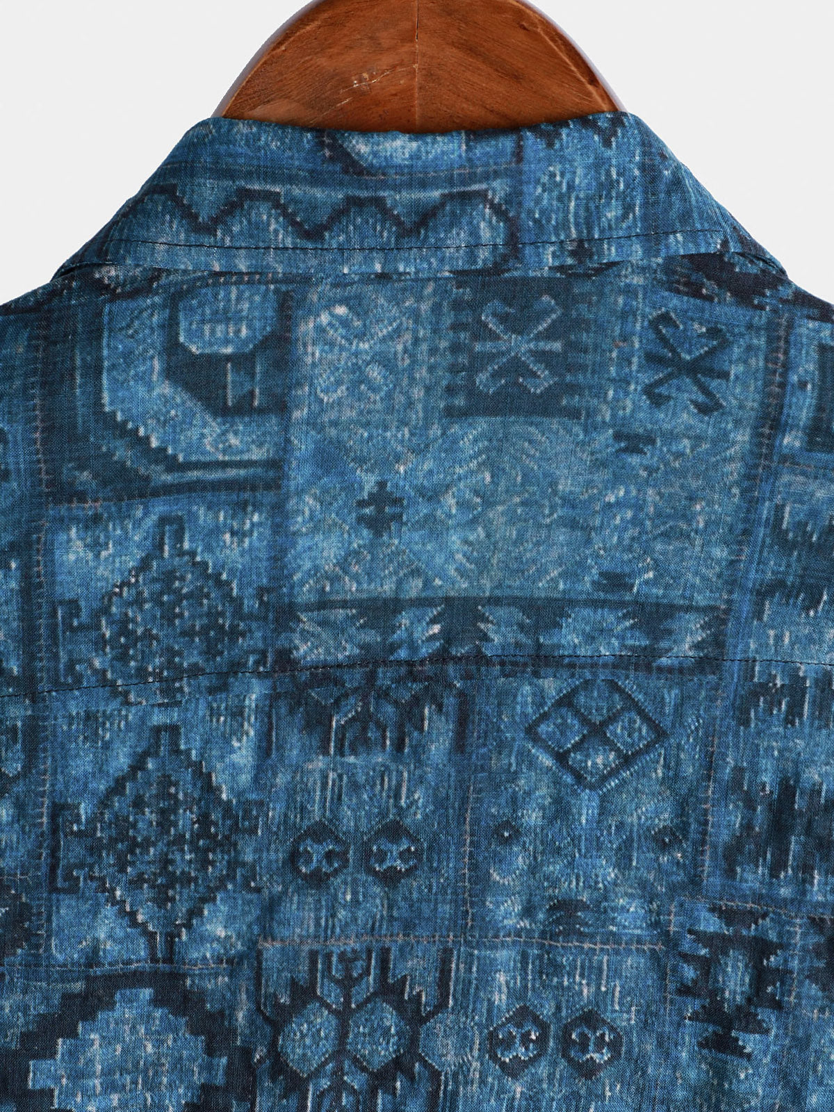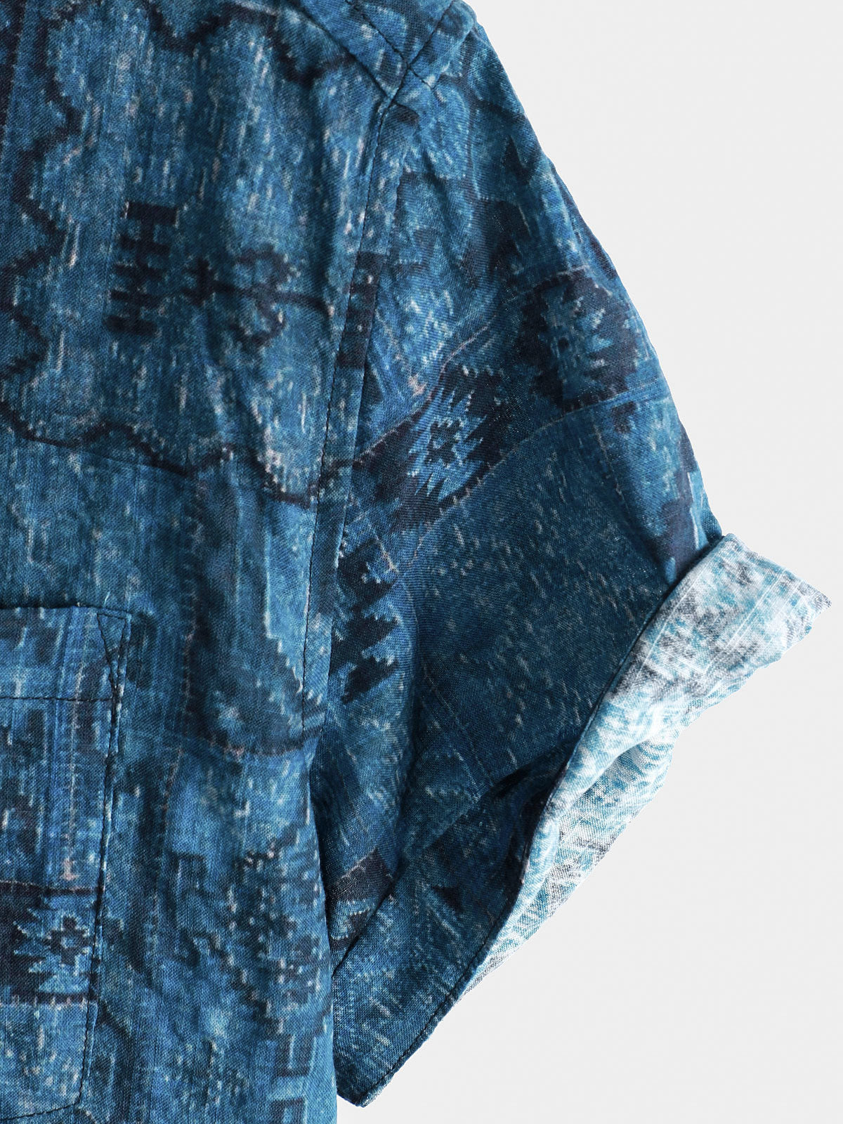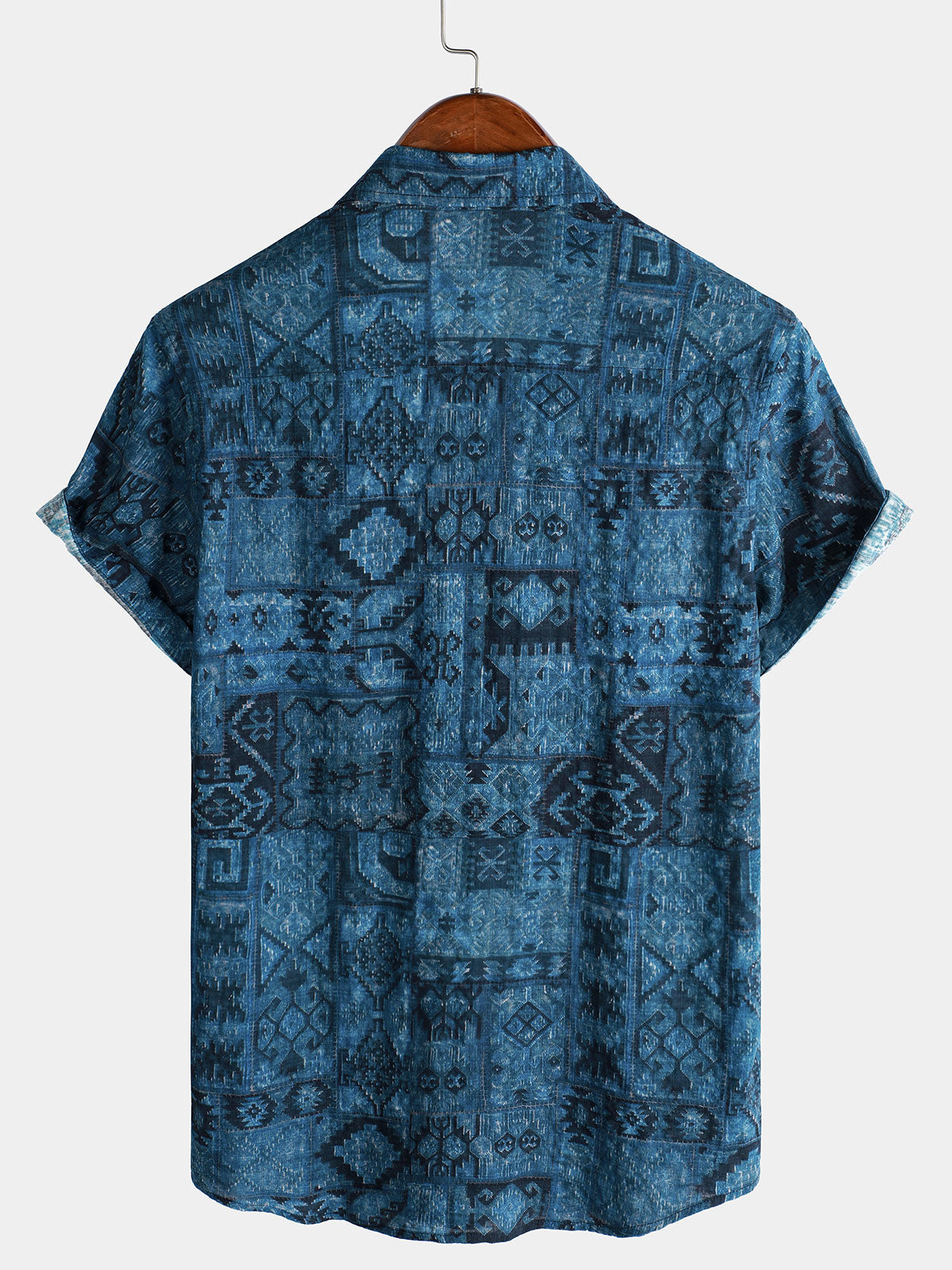 Herren Blaues Urlaubs-Kurzarmhemd mit Retro-Print