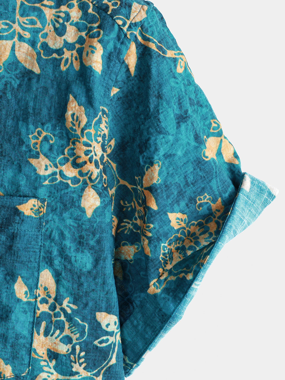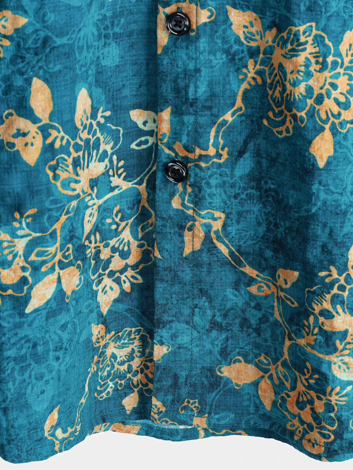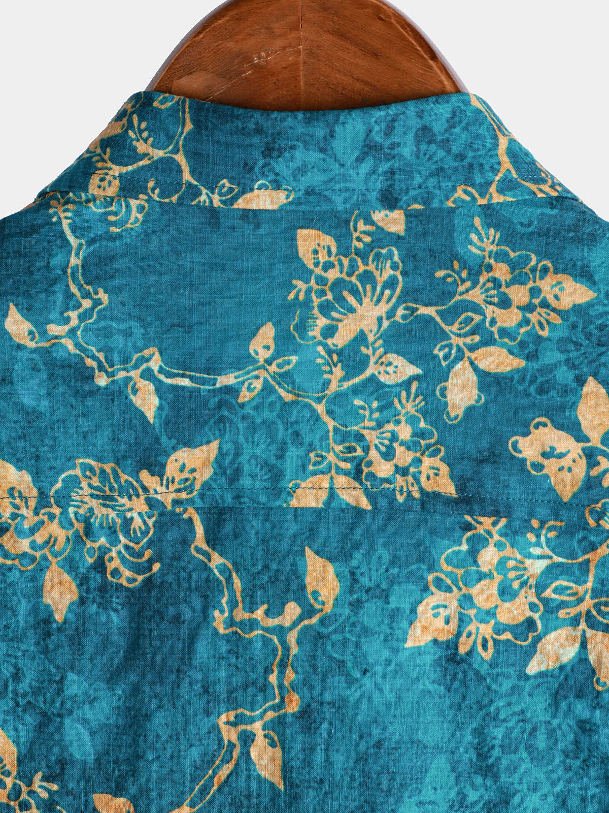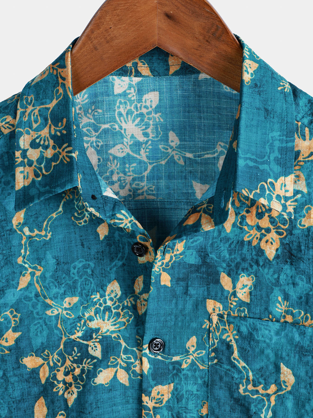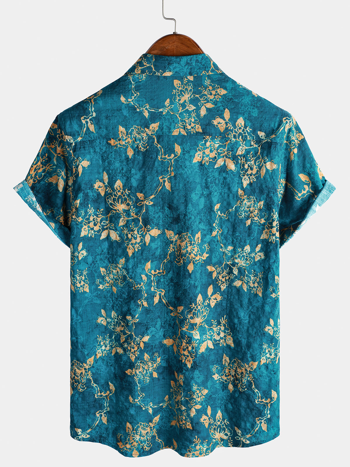 Herren Blumenmuster Sommer Kurzarm-Hawaiihemd Blau