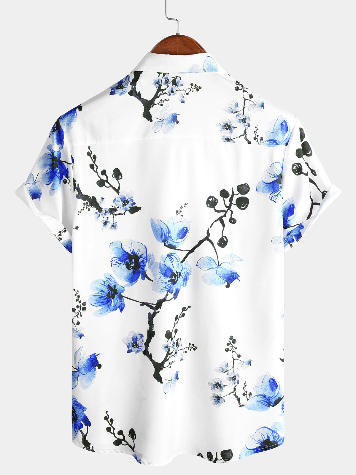 Herren Kurzarmhemd Lässiges Blaues Blumenmuster