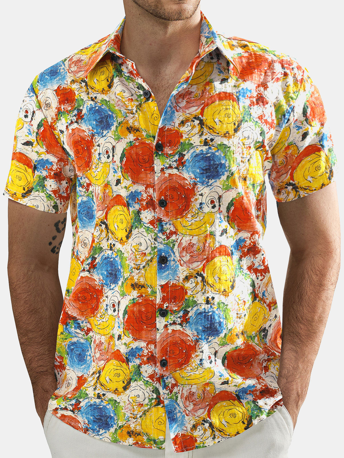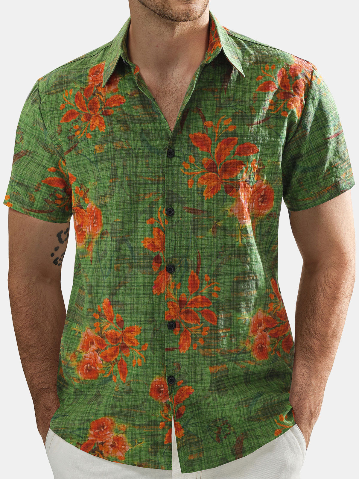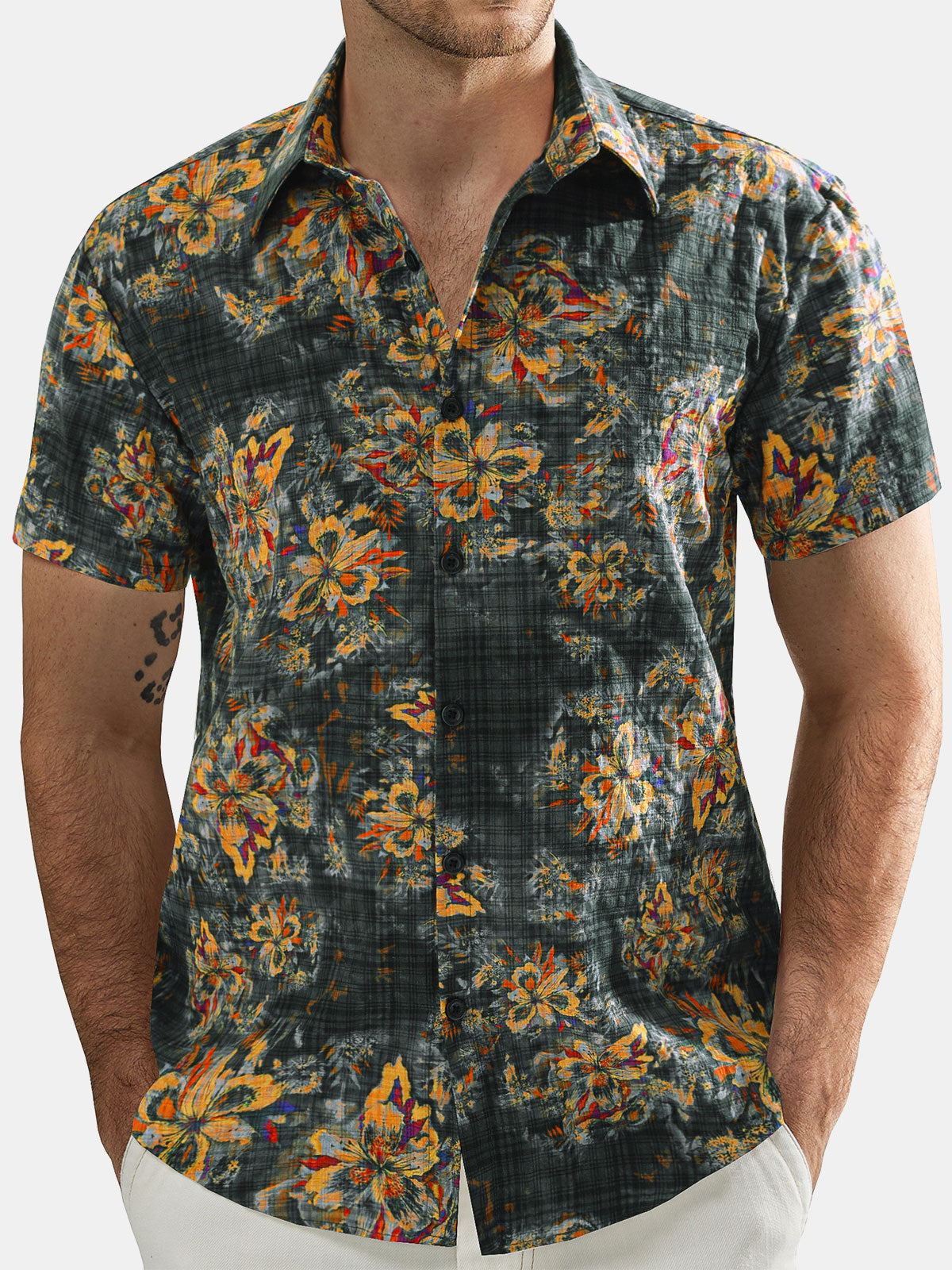 Herren Lässiges Kurzarmhemd aus Baumwolle mit Blumenmuster