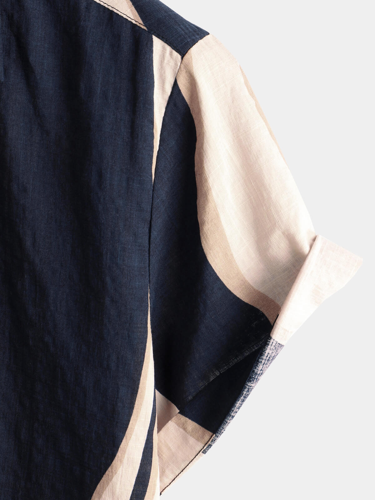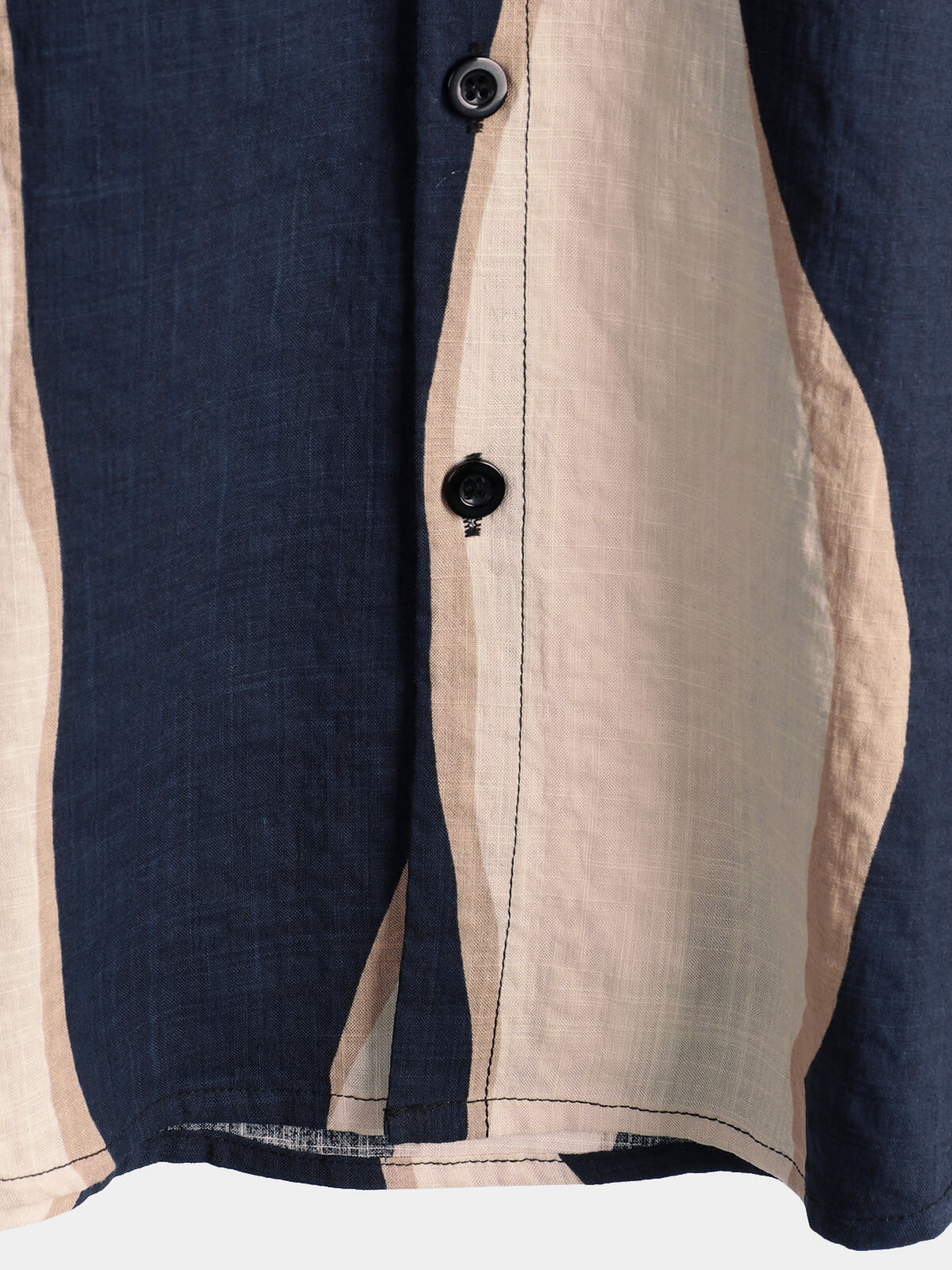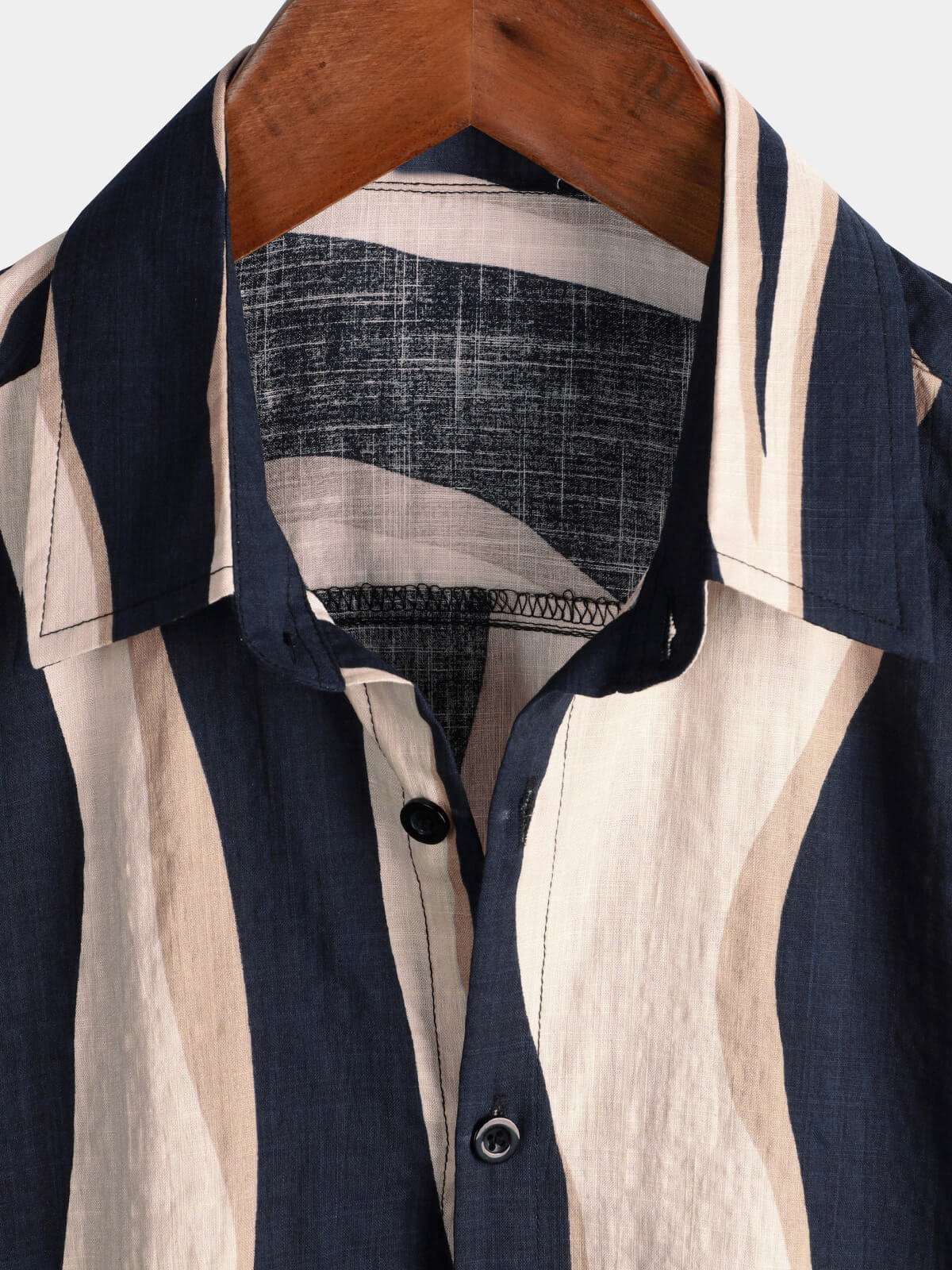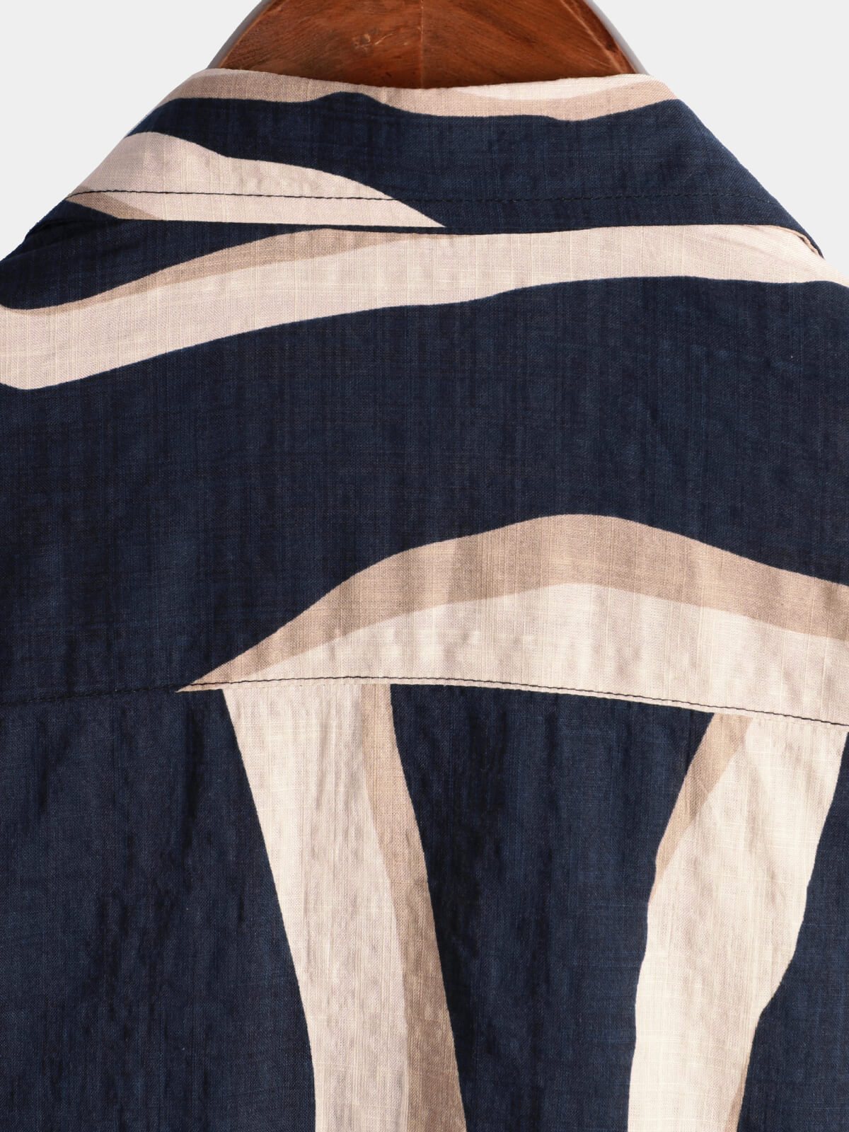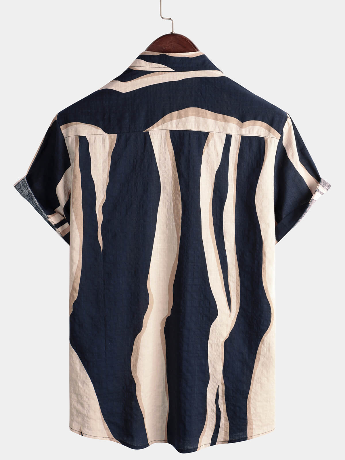 Herren Retro Casual Gestreiftes Sommerurlaub Marineblaues Kurzarmhemd mit Knöpfen