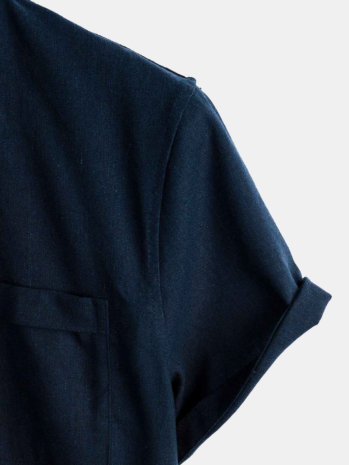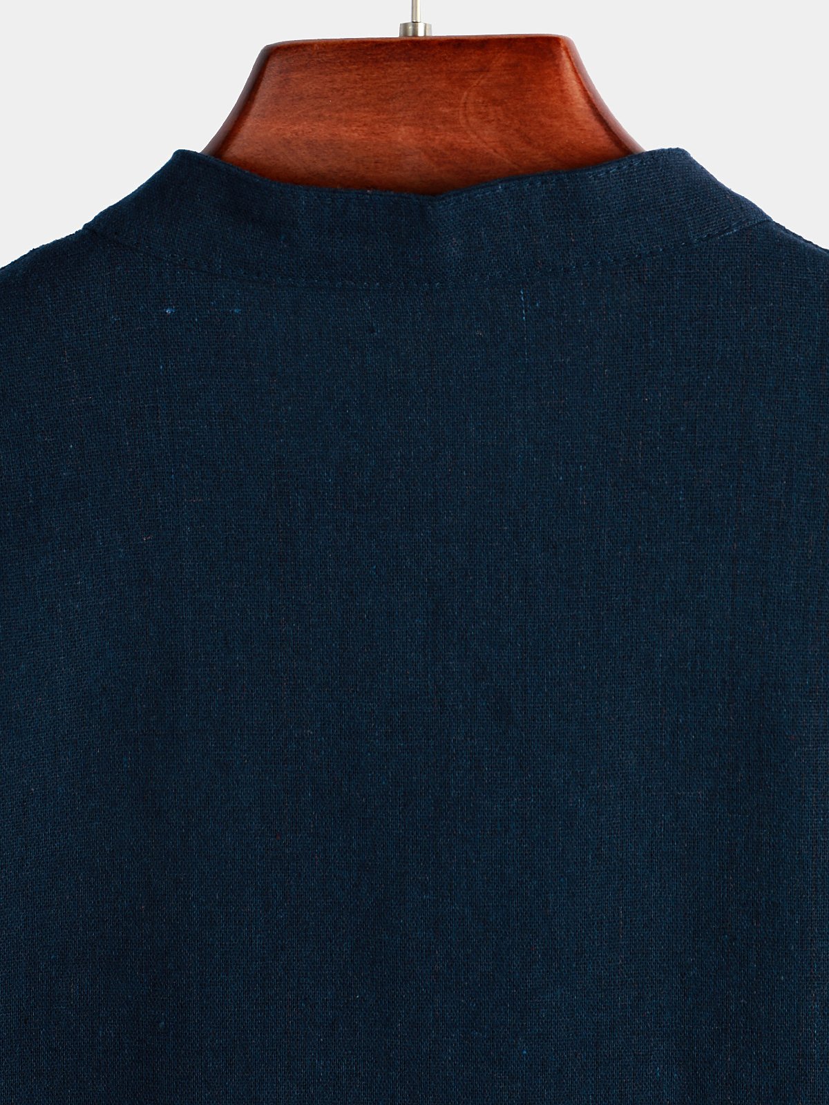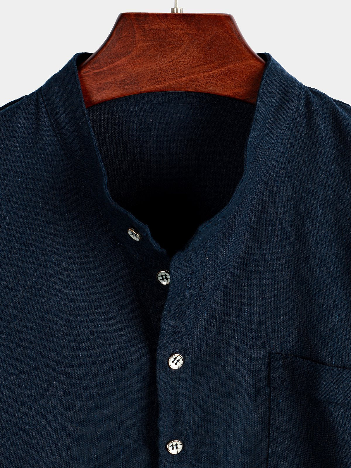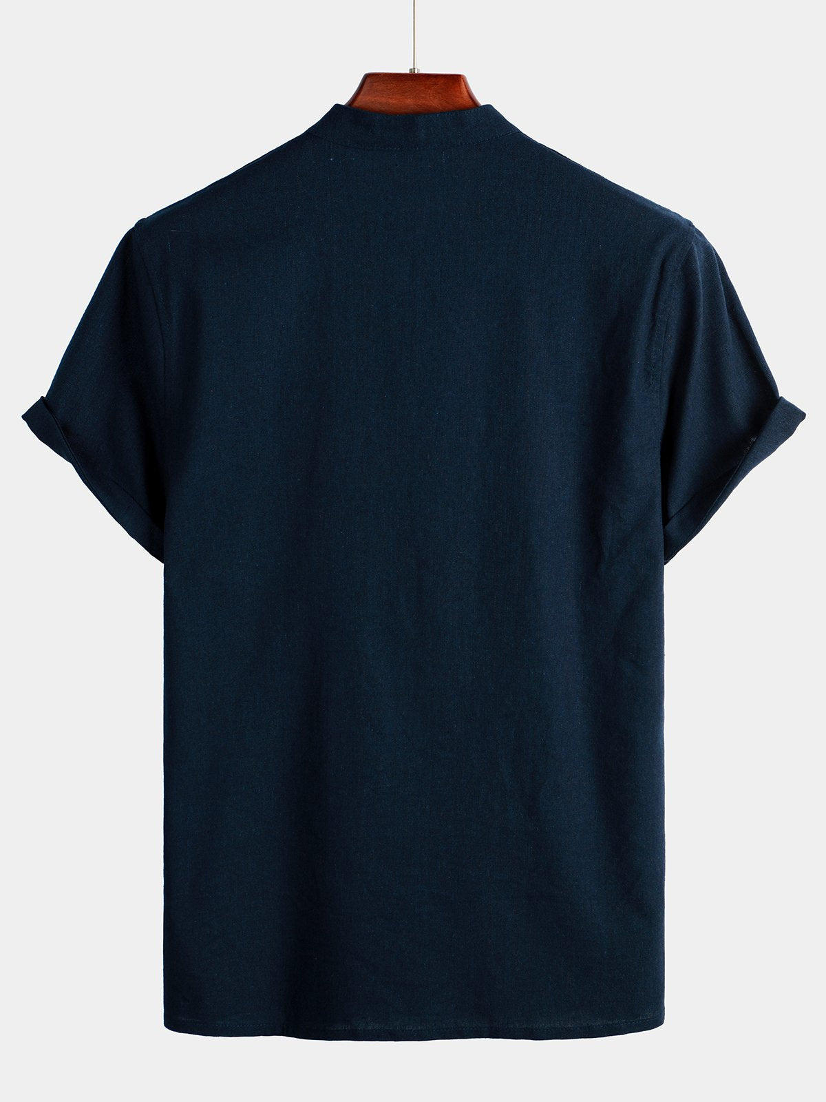 Herren Lässiges Kurzarmhemd Baumwolle Leinen mit Henry-Kragen