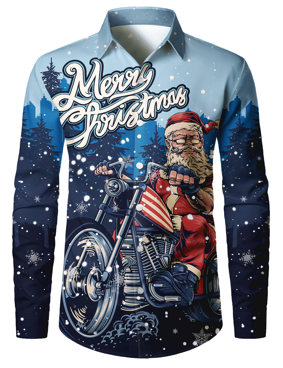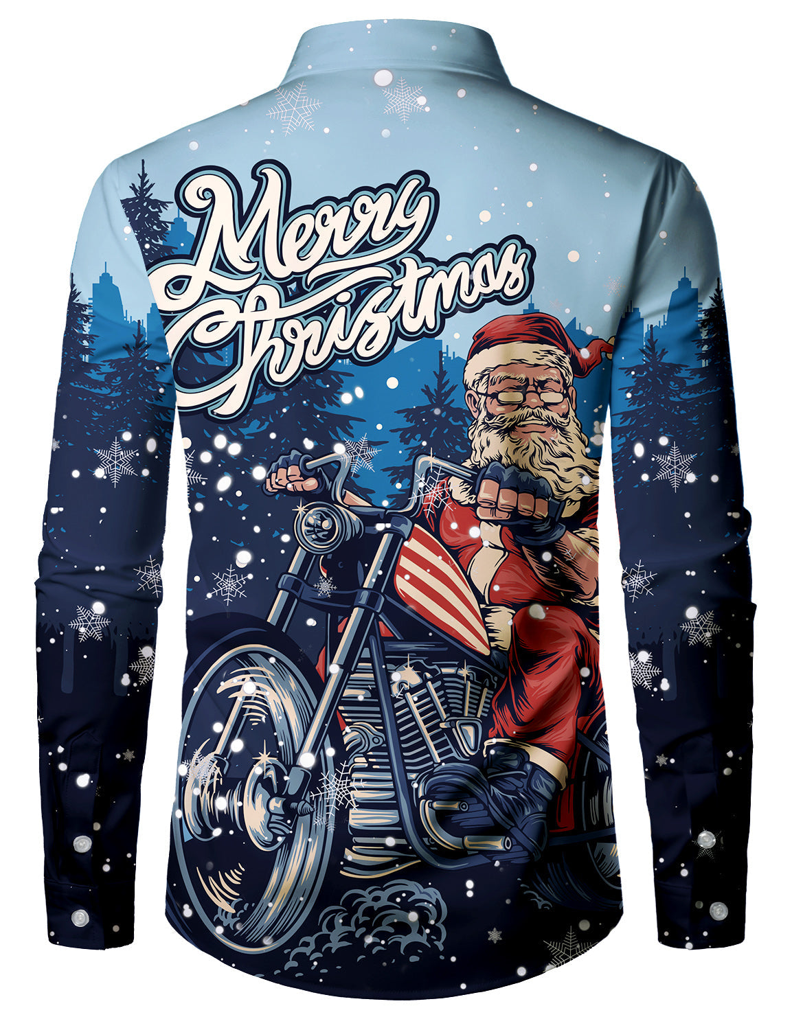 Herren Weihnachtsmann-Motorrad-Aufdruck Weihnachtshemd Blau