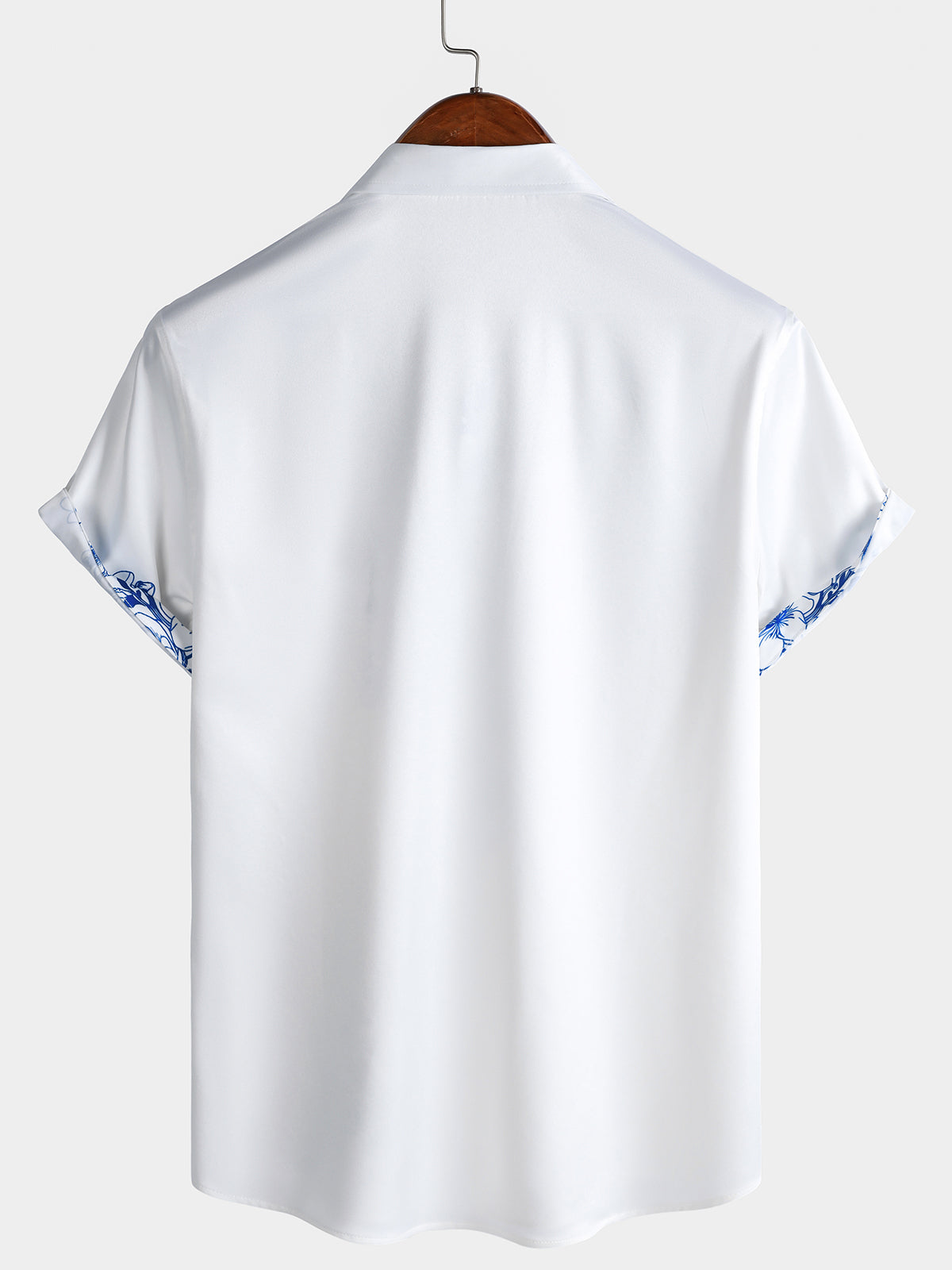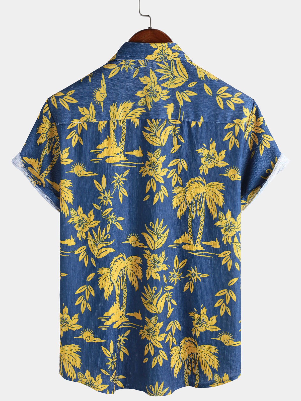 Herren Tropischem Print Sommer Kurzen Ärmeln Blau Hemd