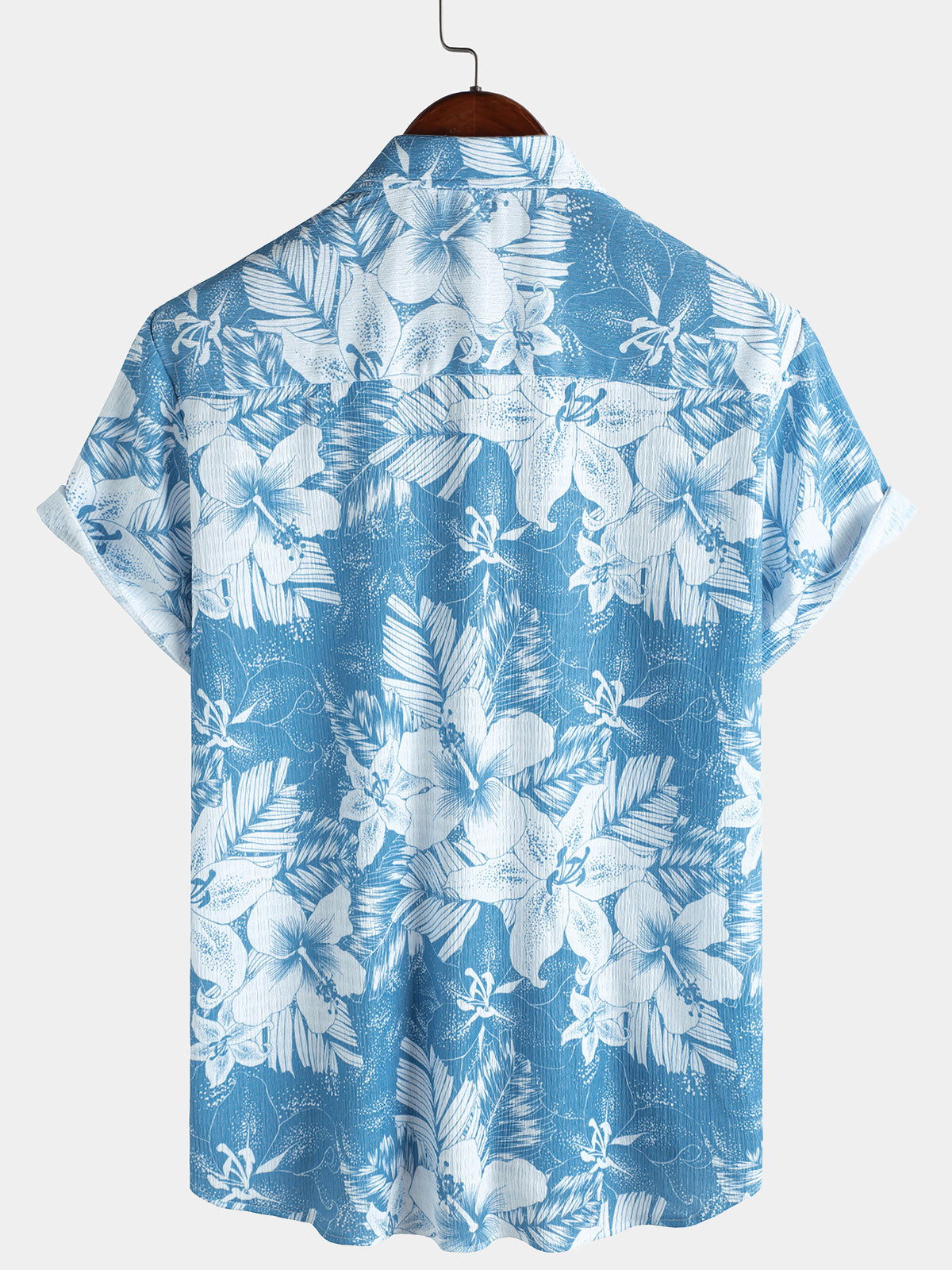 Herren Baumwolle Blaues Sommer-Kurzarmhemd mit Blumenmuster