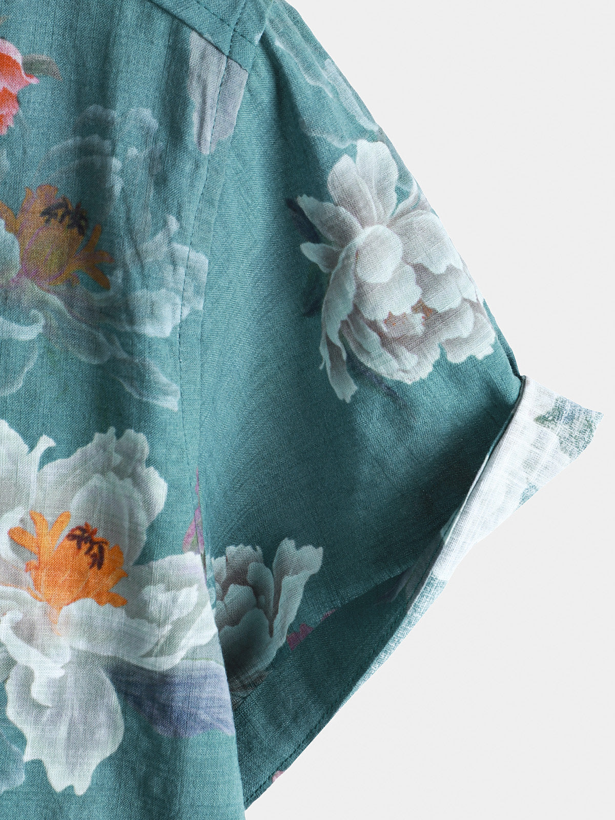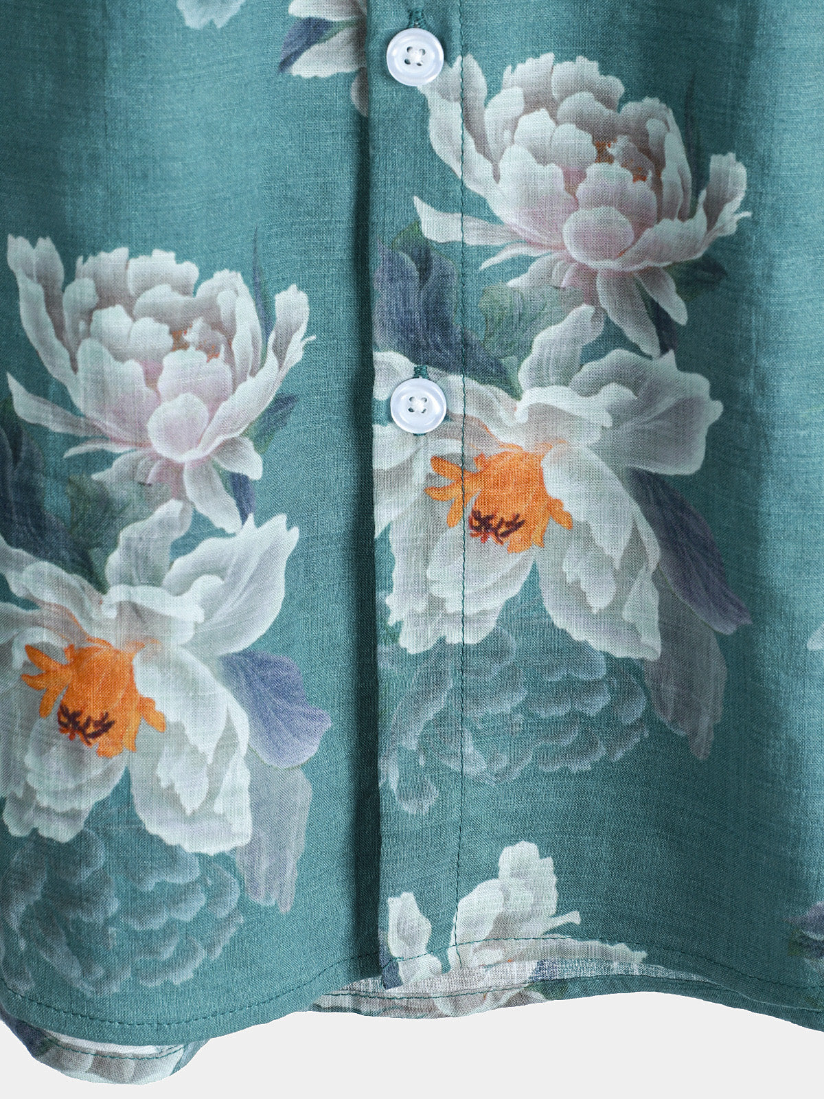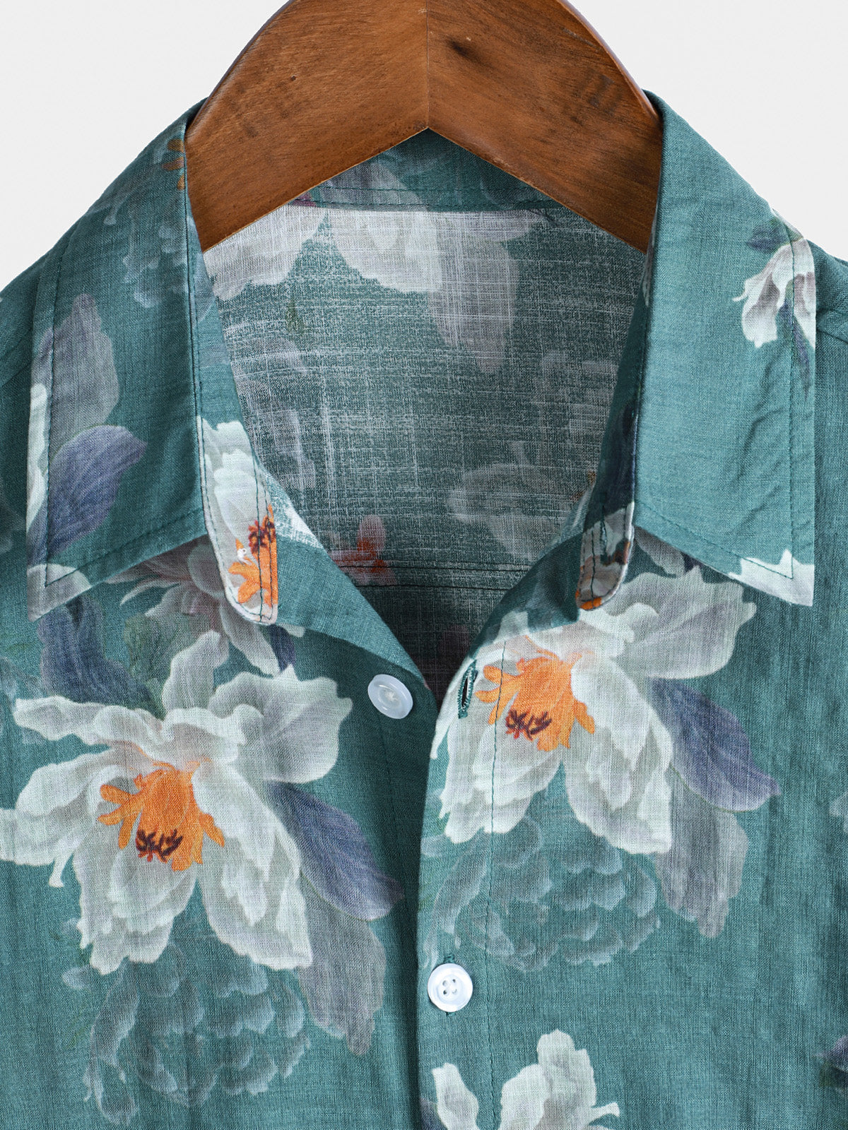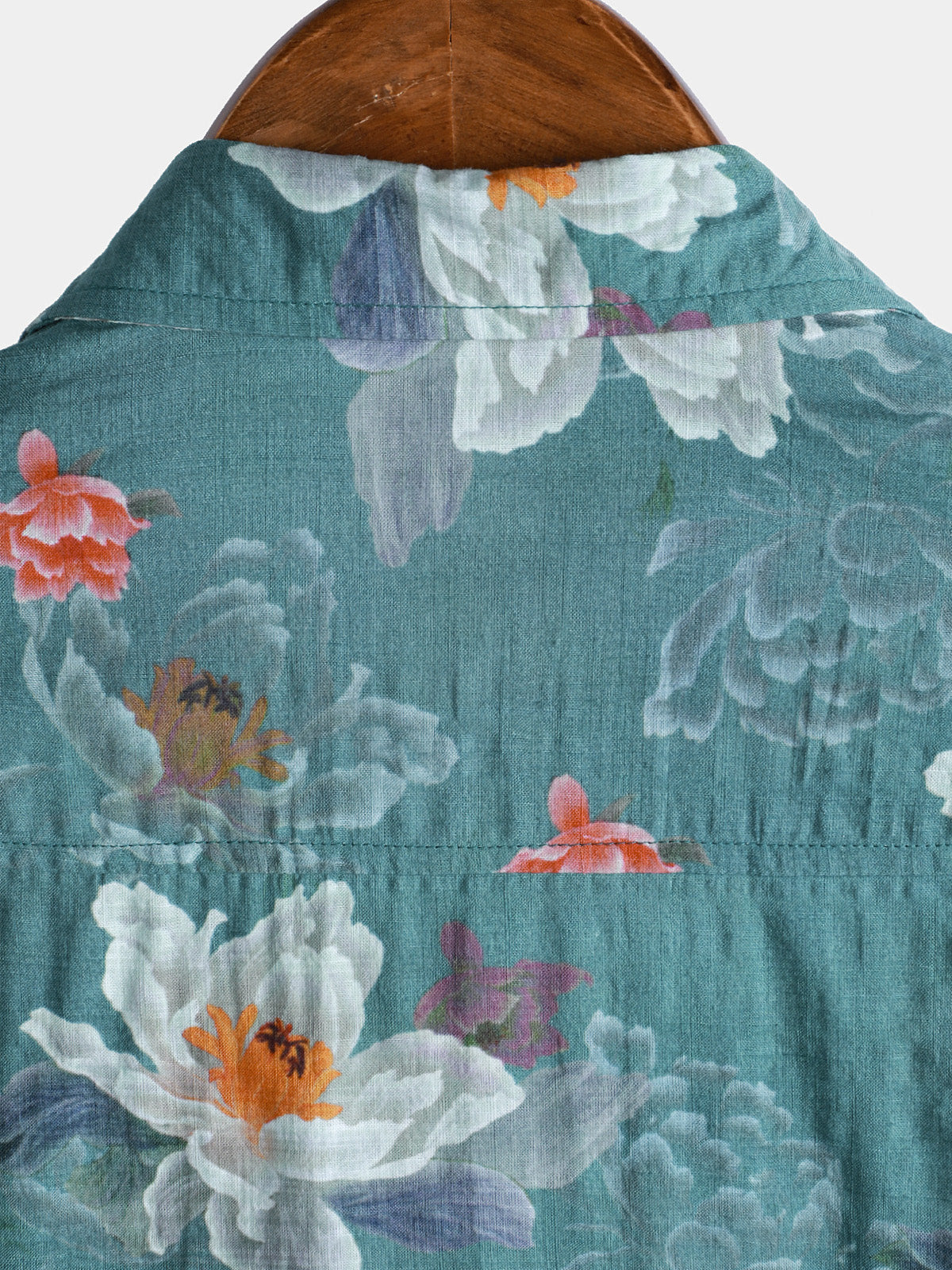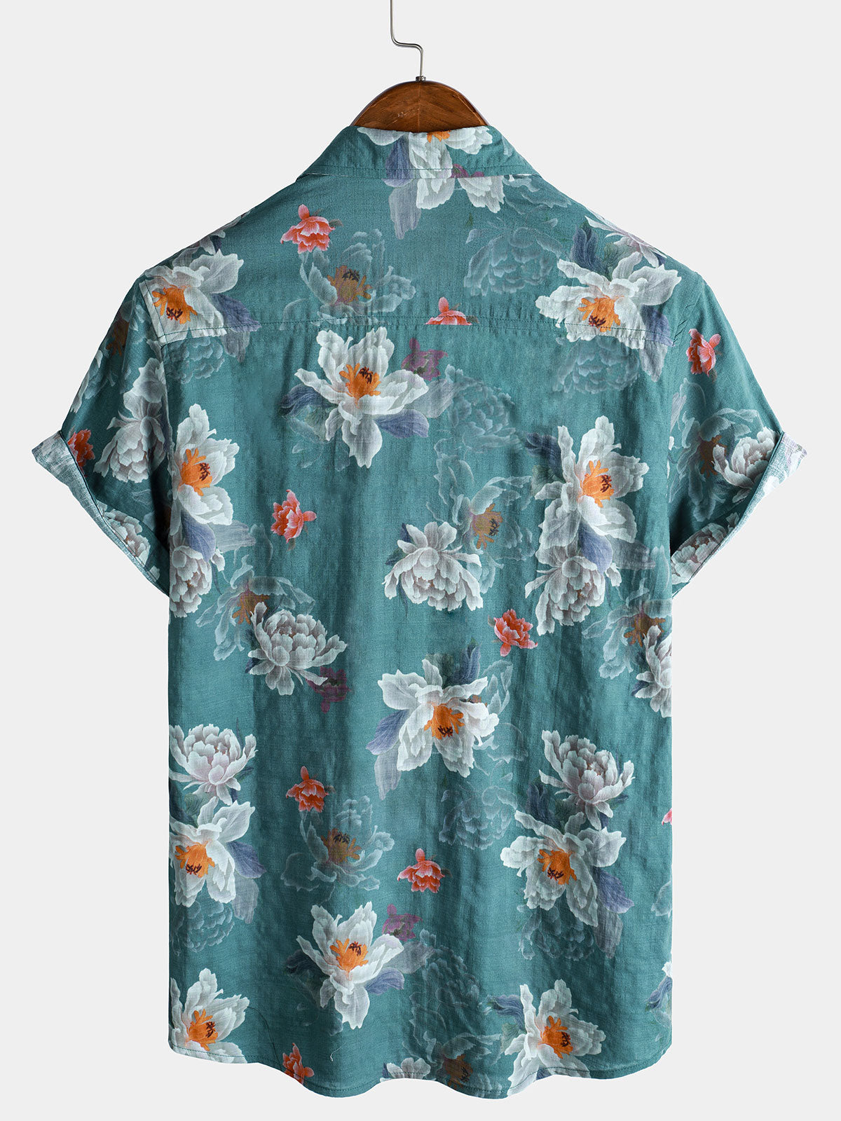Herren Baumwolle Blaues Sommer-Kurzarmhemd mit Blumenmuster