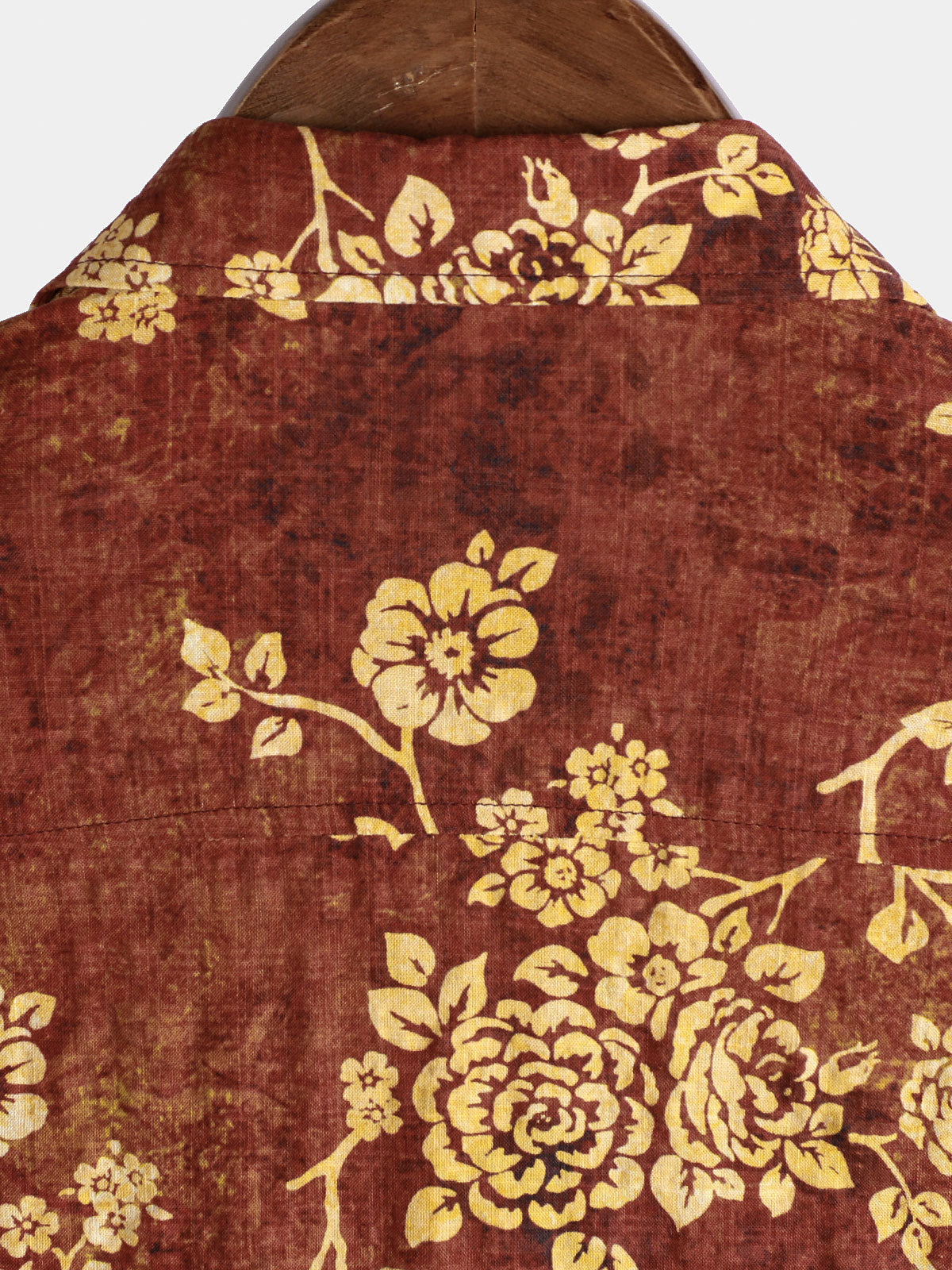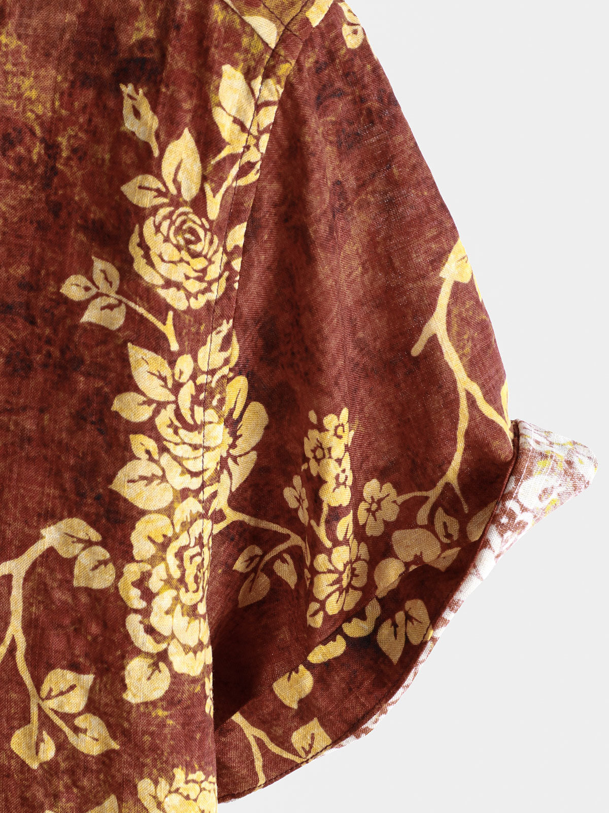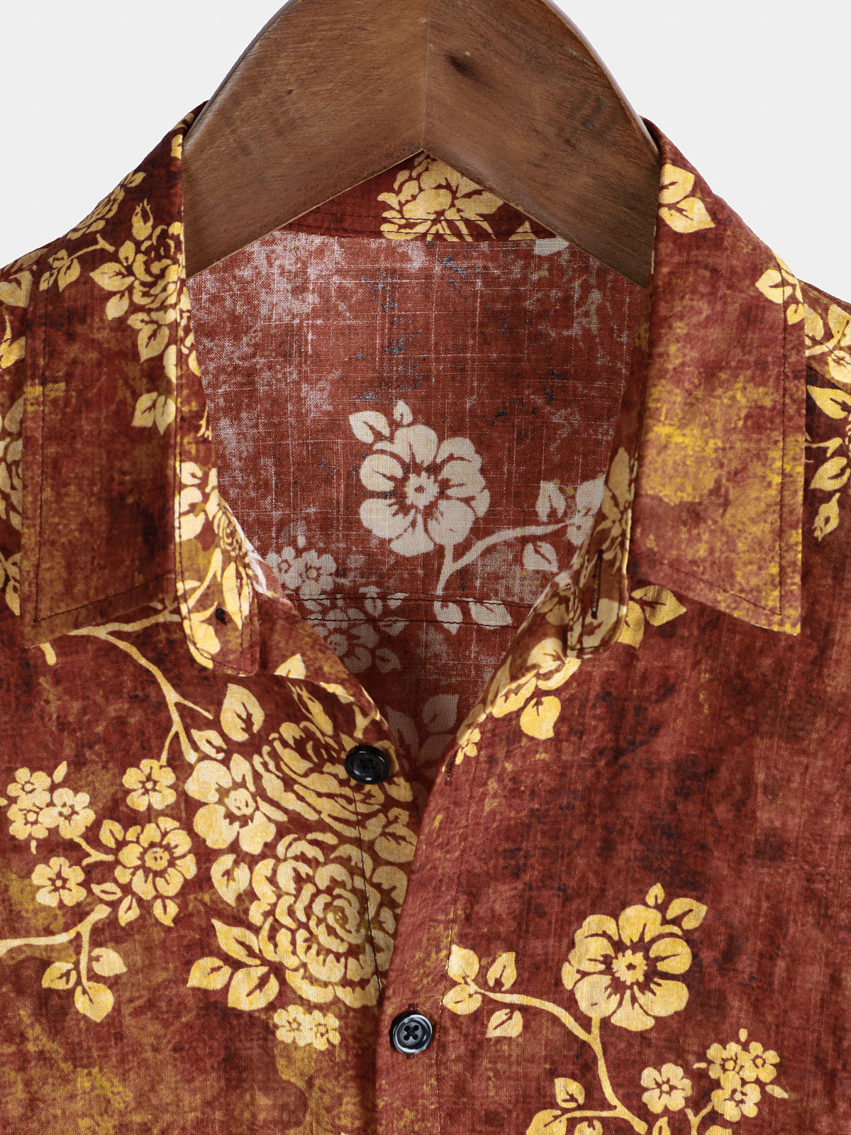 Herren Blumen-Retro-Kurzarmhemd aus Baumwolle Braun