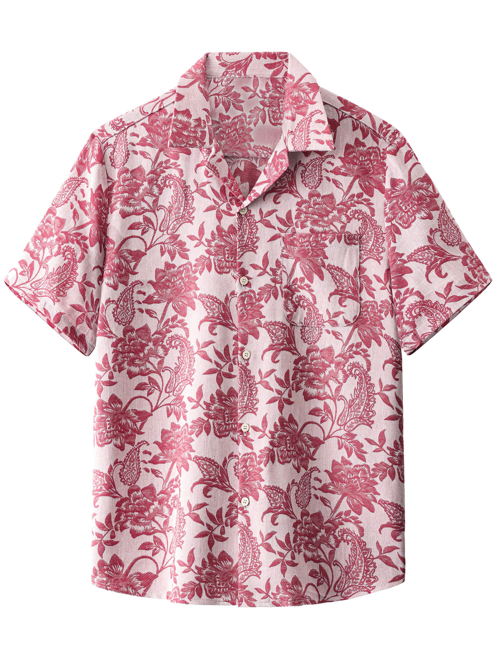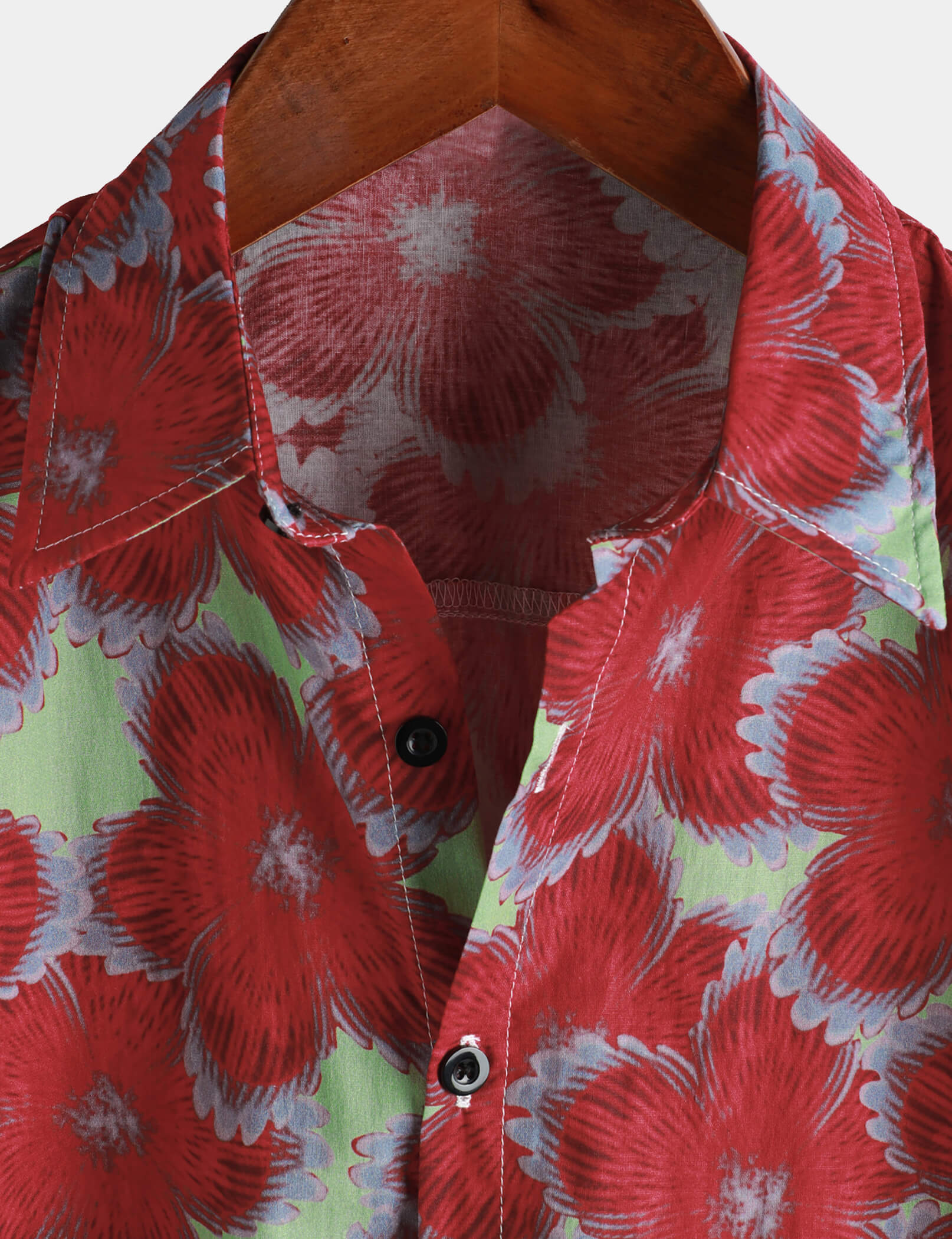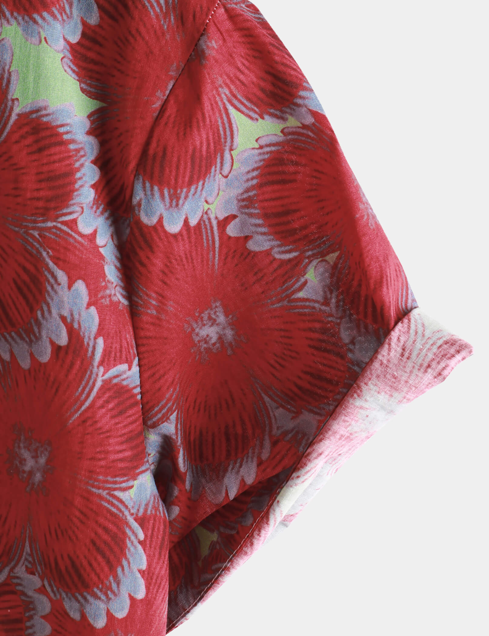 Herren Kurzarmhemd aus roter Baumwolle mit Blumenmuster