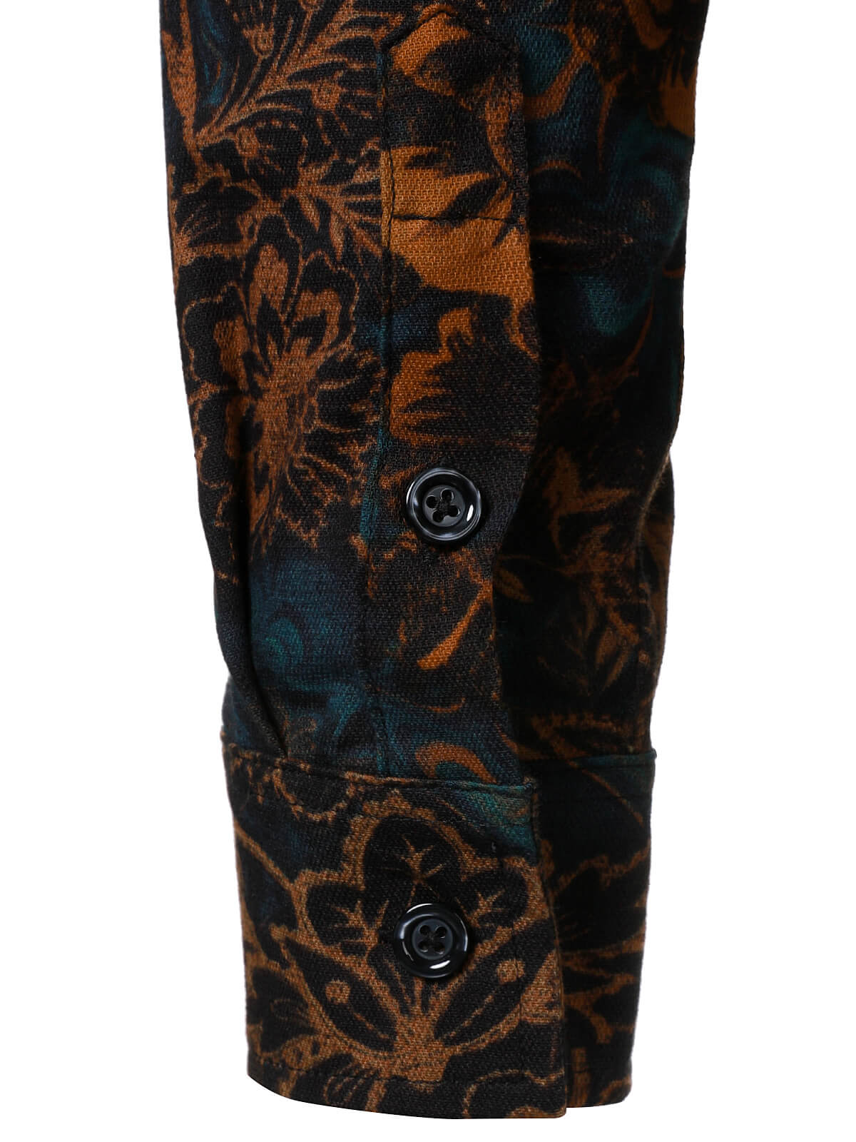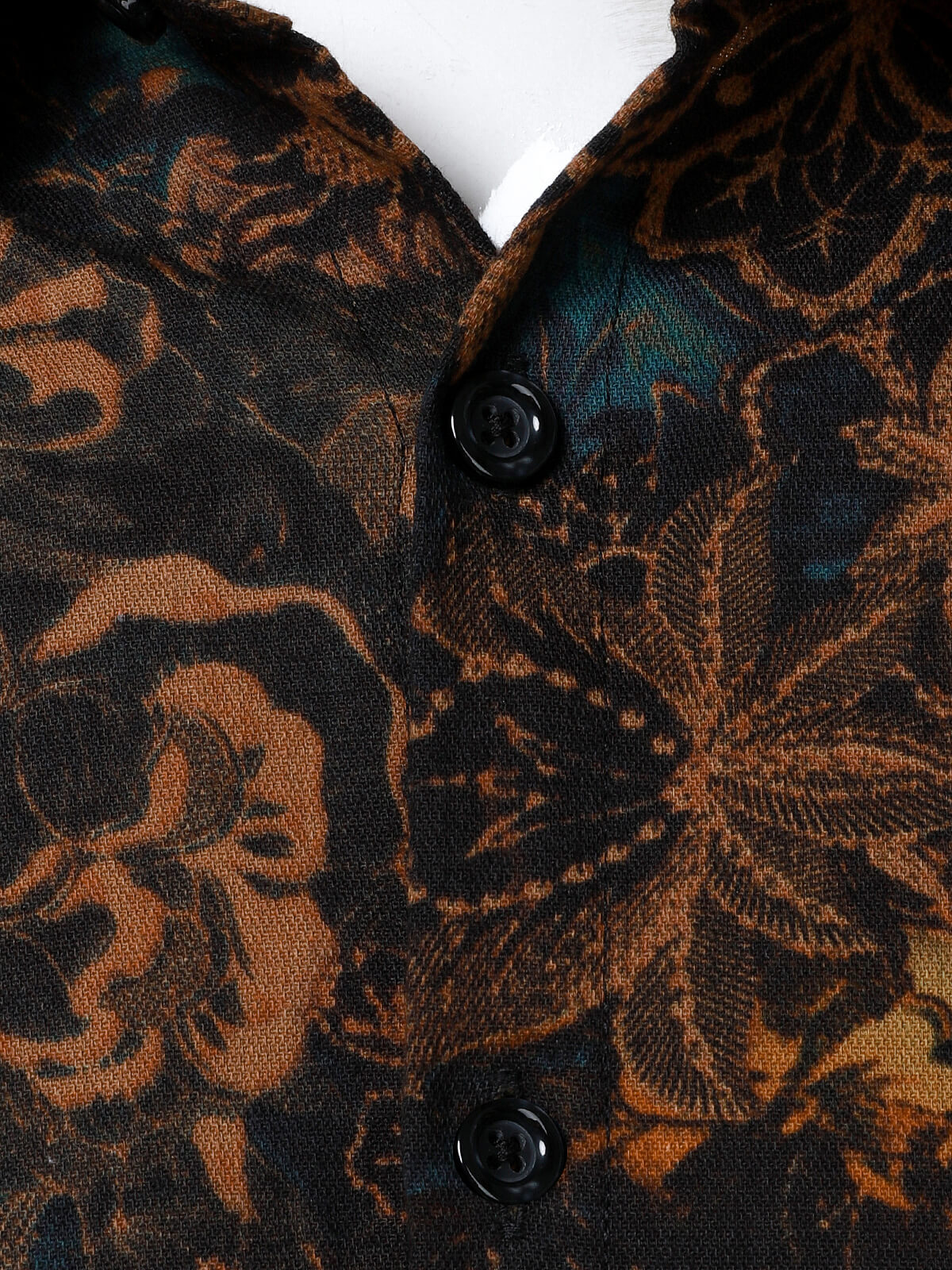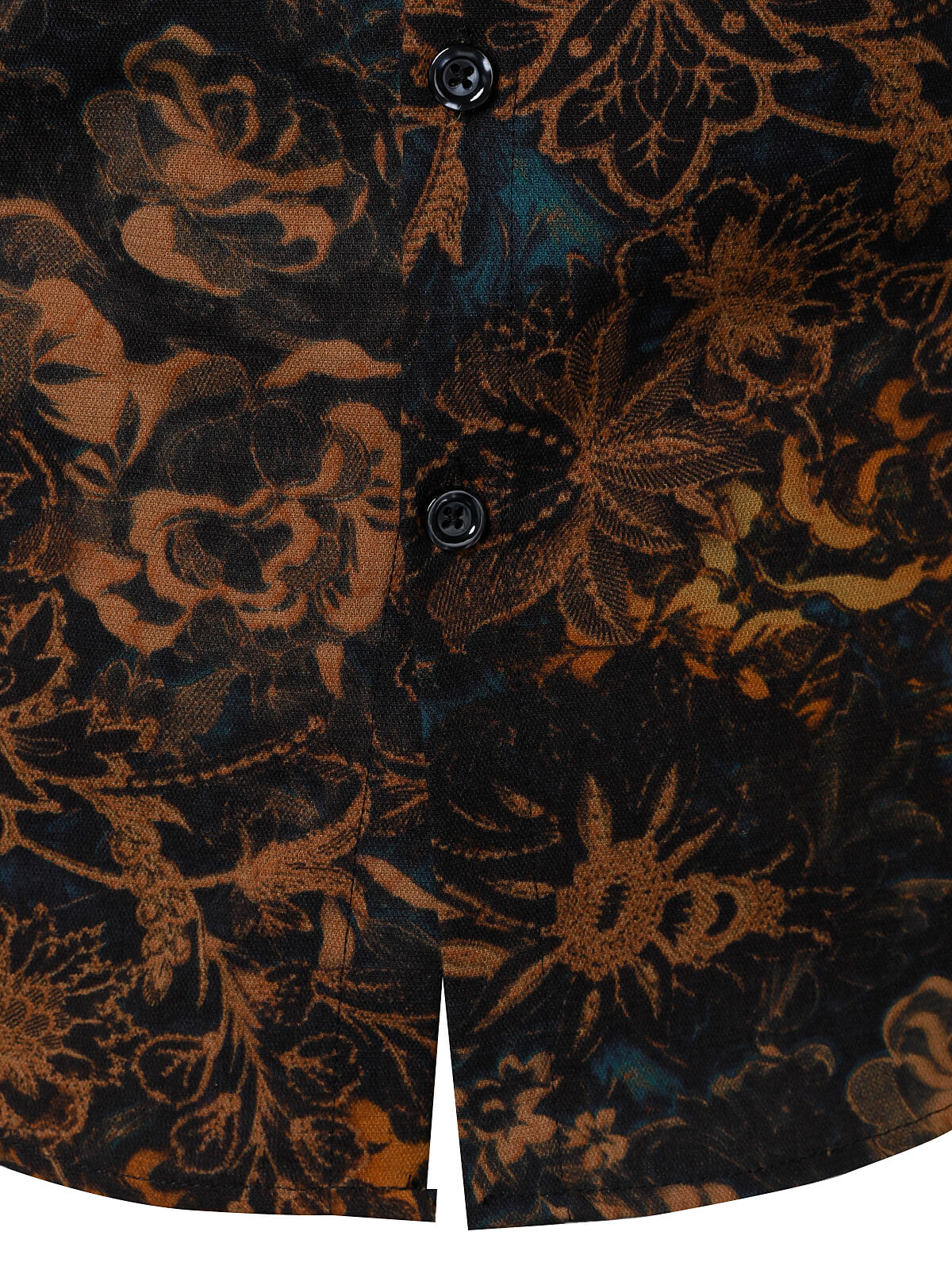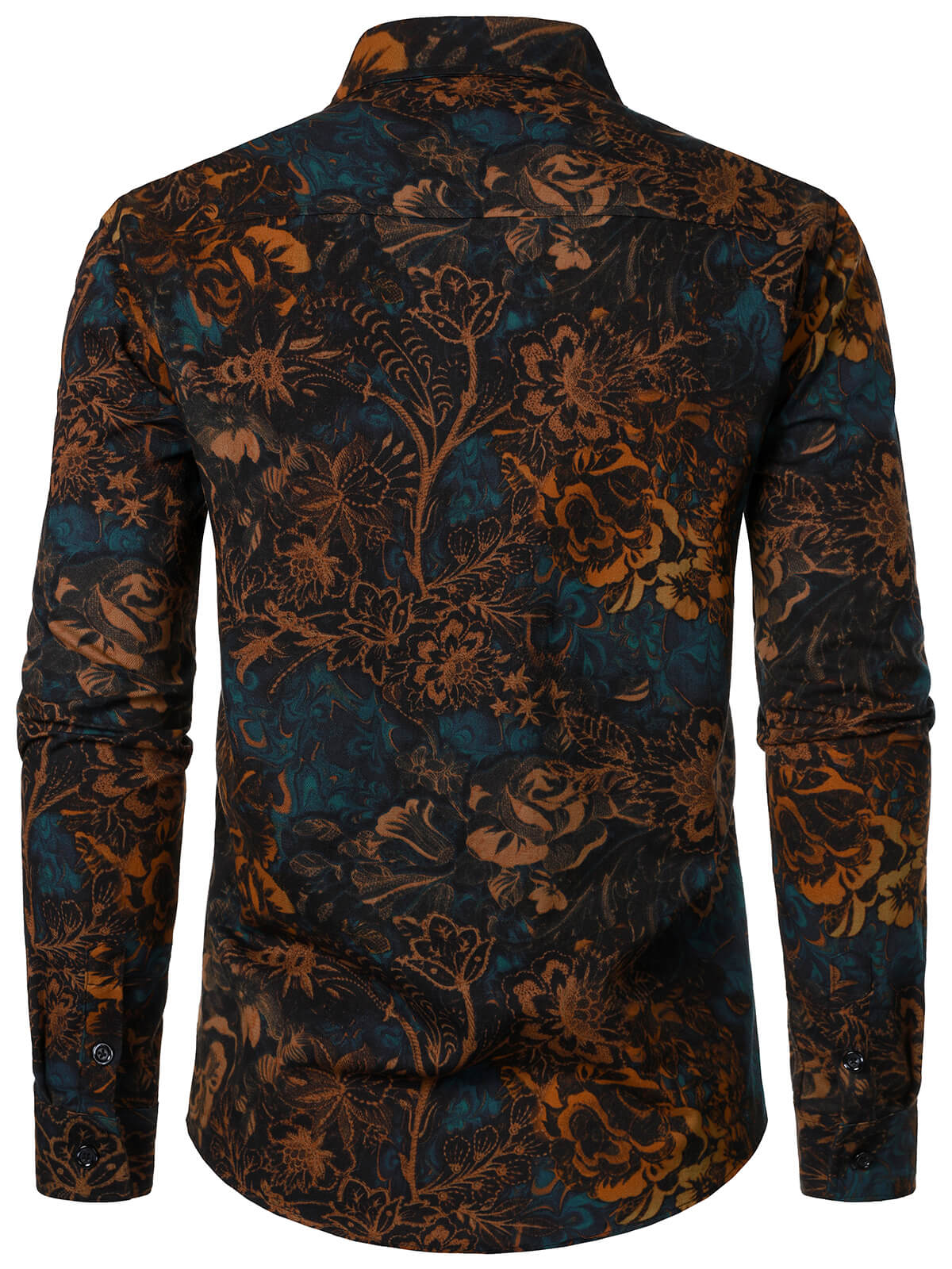 Herren Baumwolle Retro-Blumendruck Langarmhemd Braun