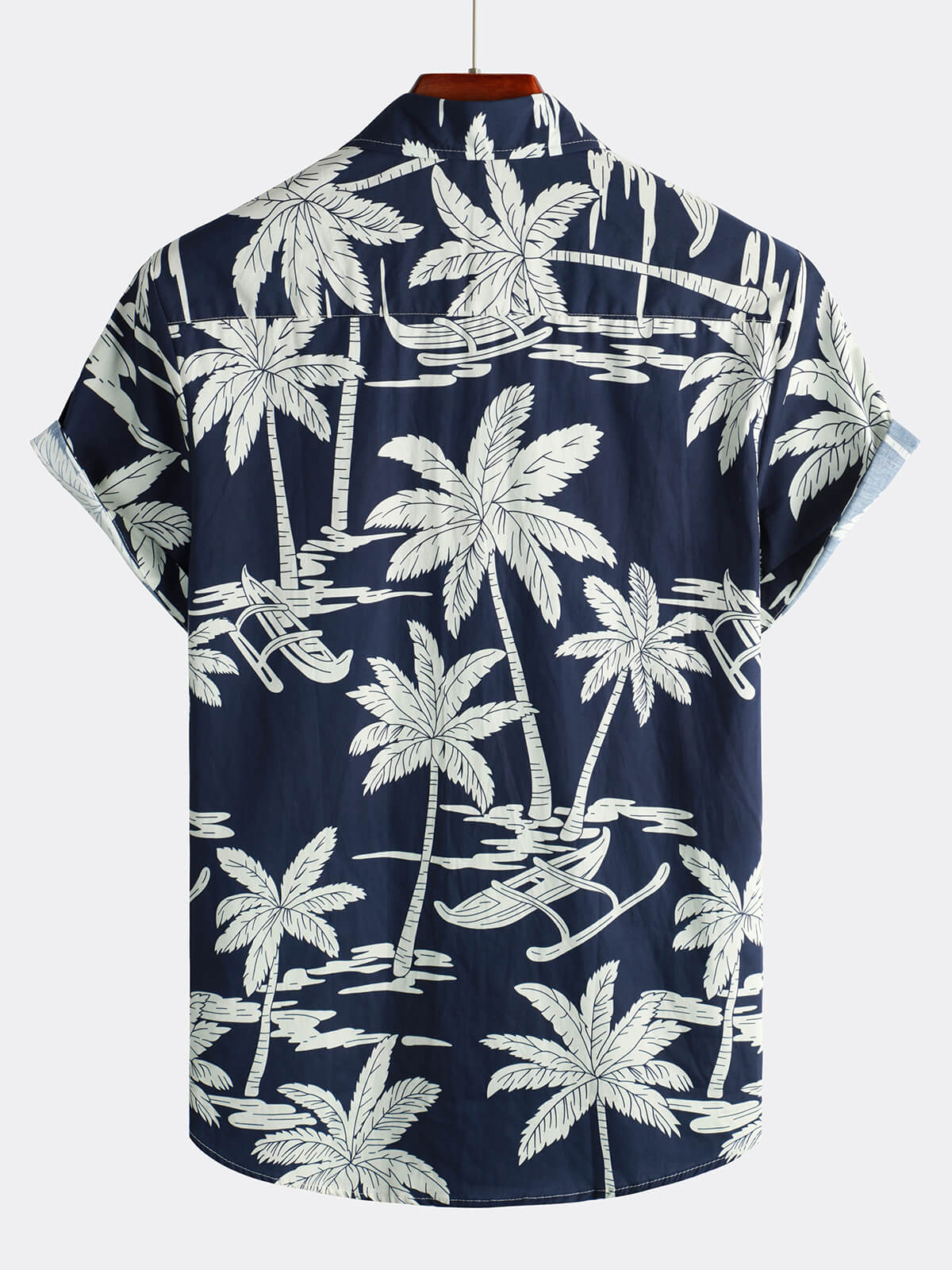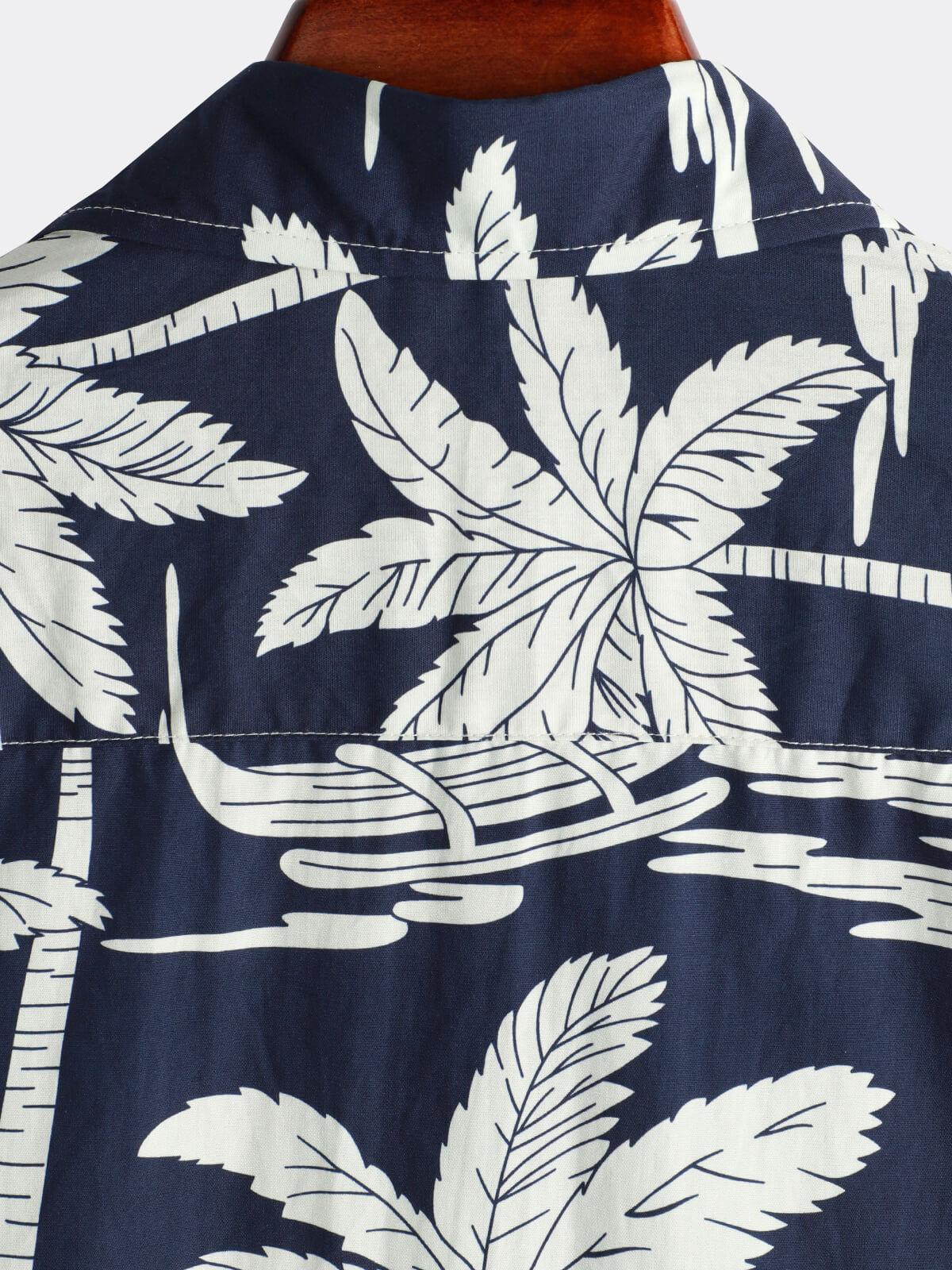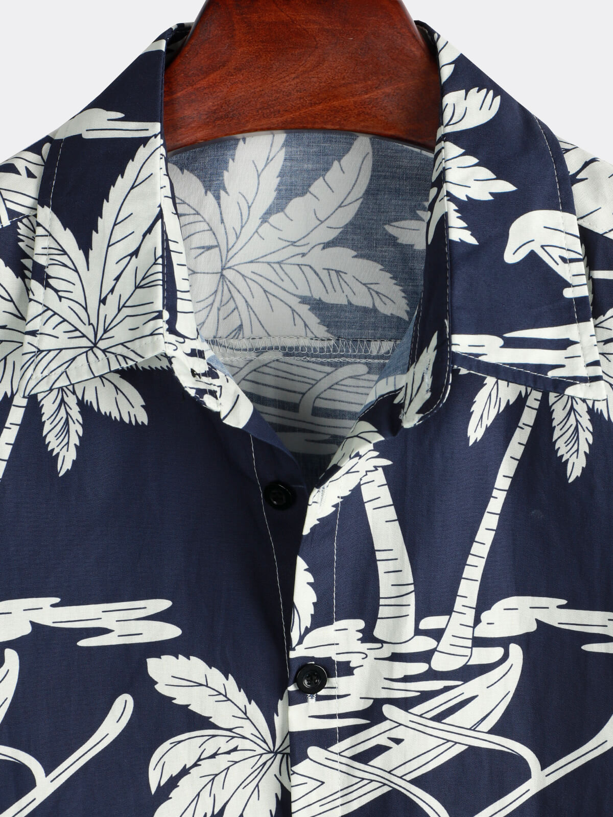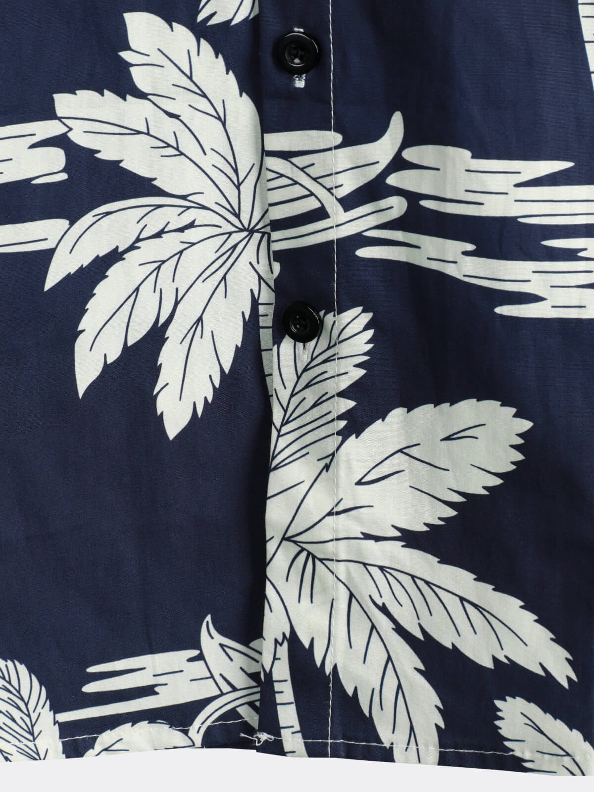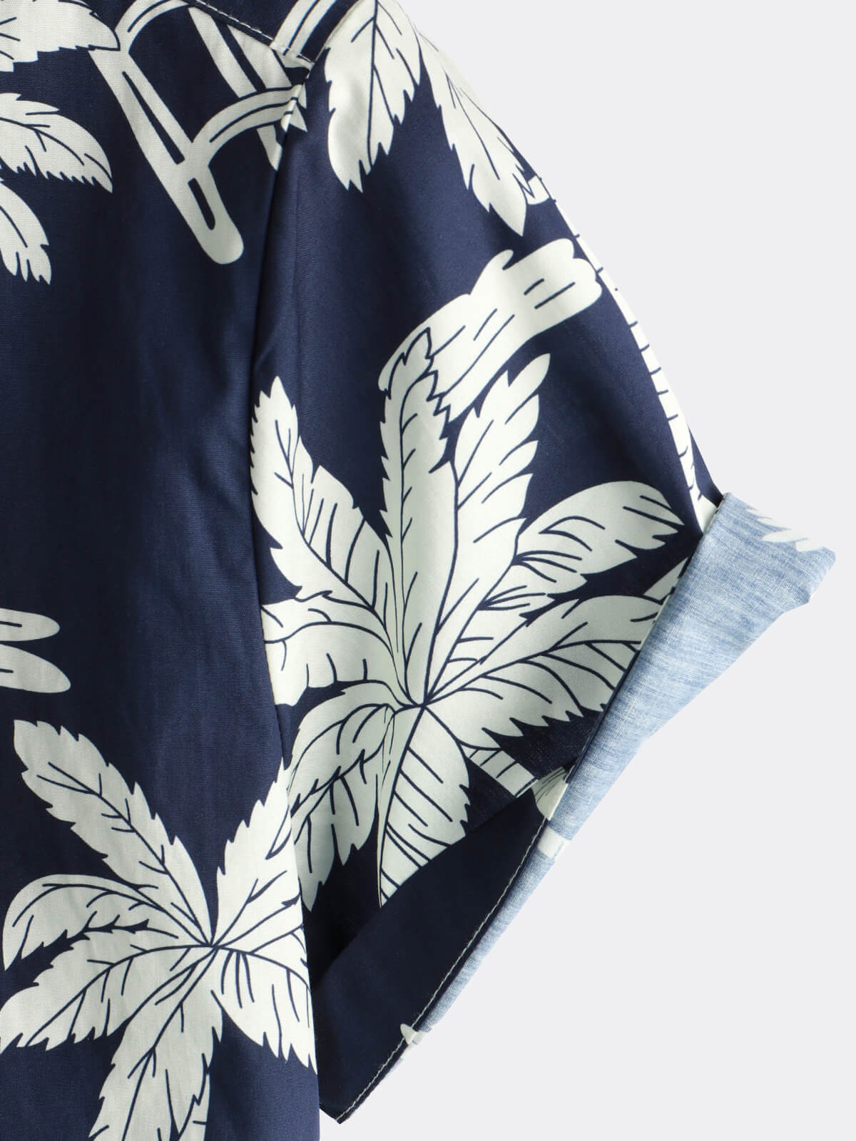 Herren Blumendruck Baumwolle Kurzarmhemd Navy Blau