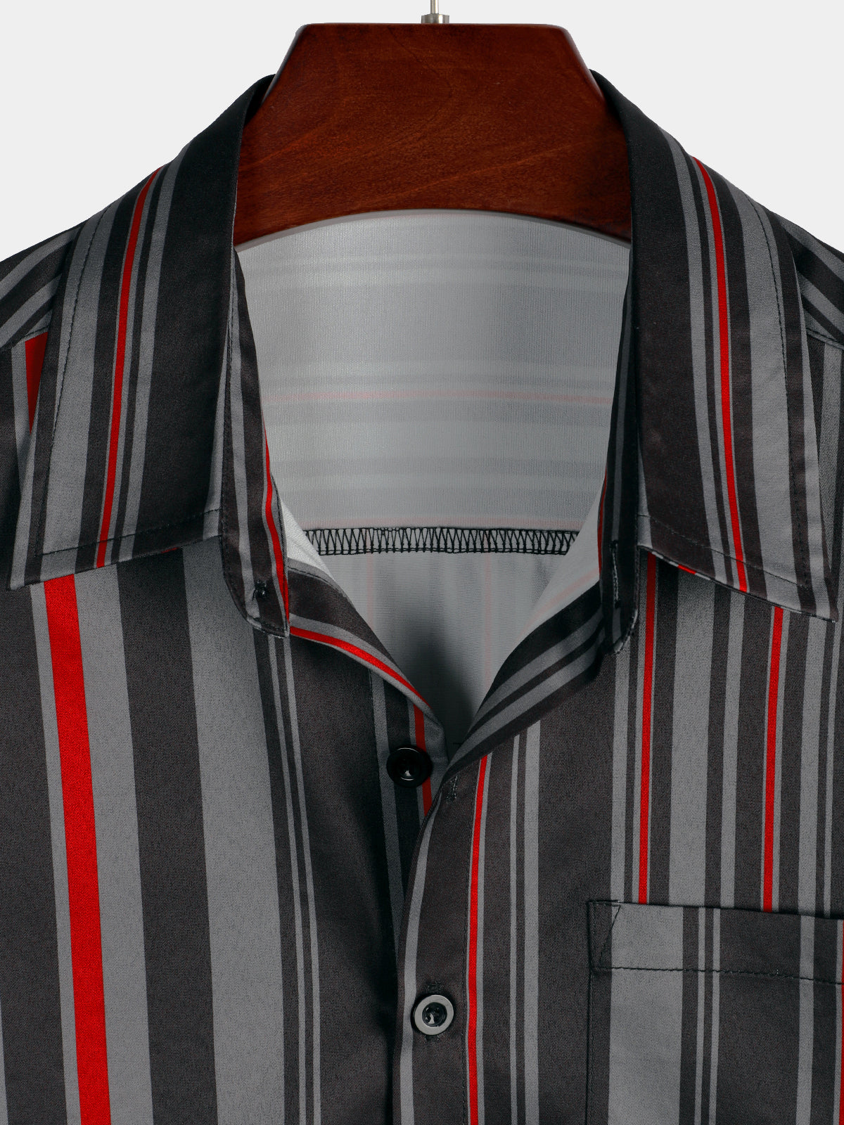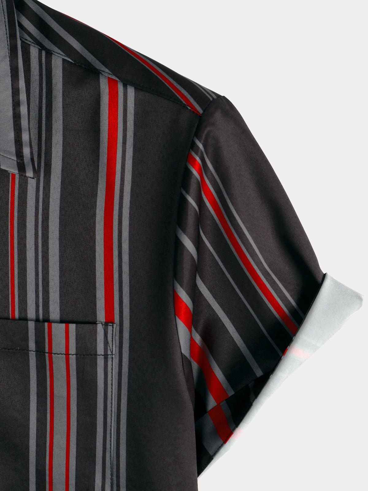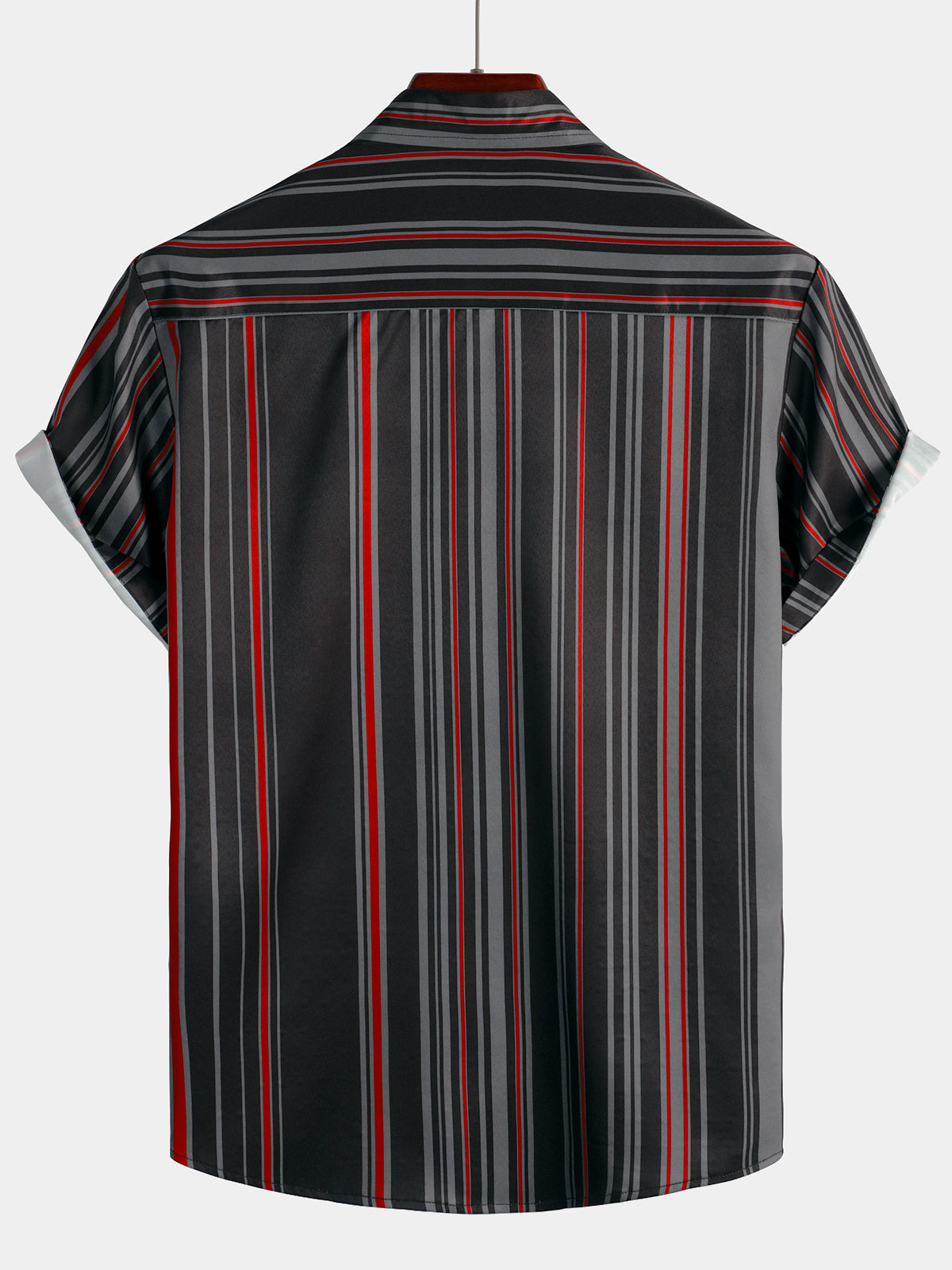 Herren Retro Schwarz-Rot Vertikal Gestreiftes Vintage Kurzarmhemd