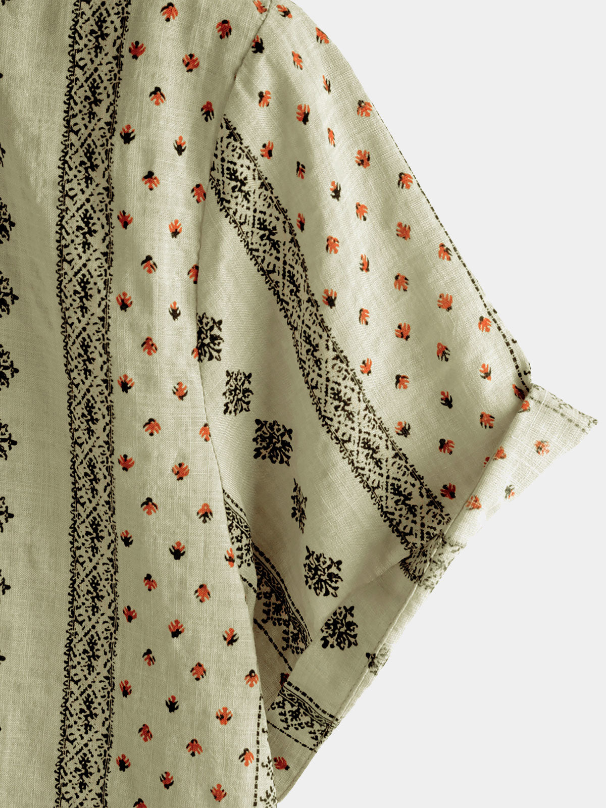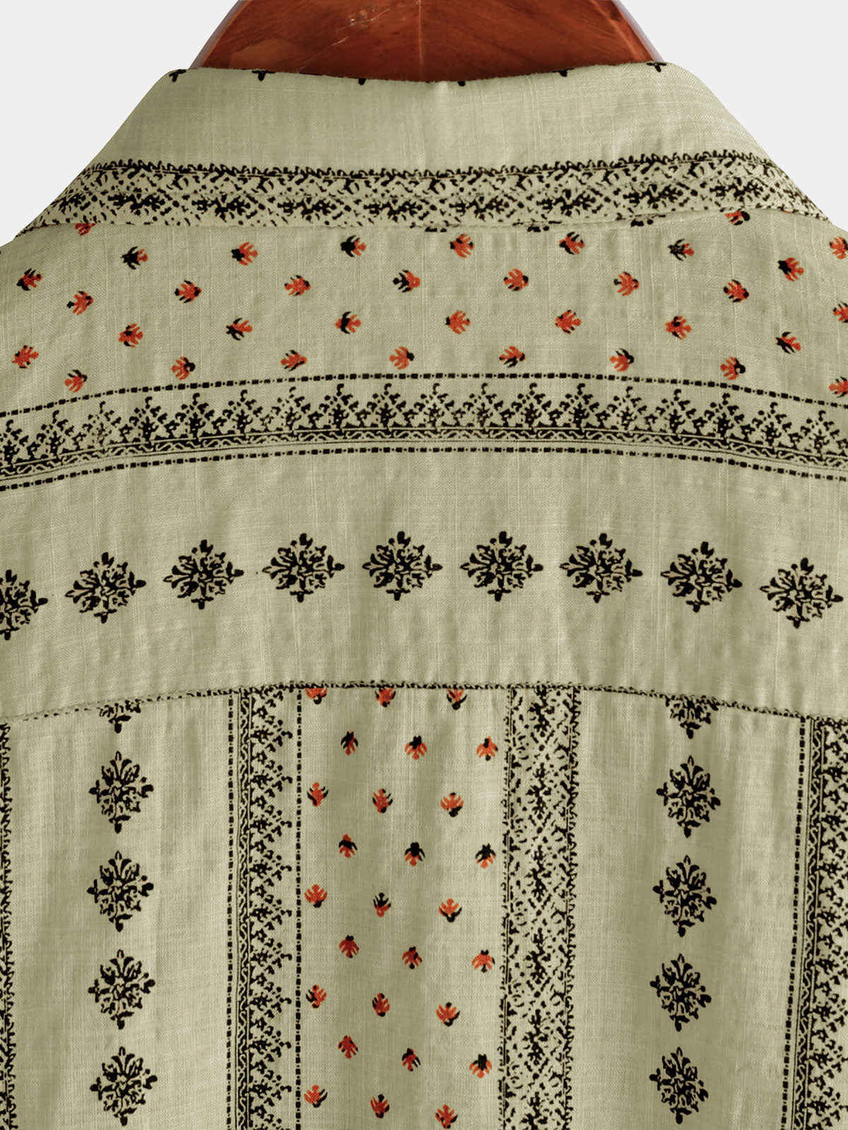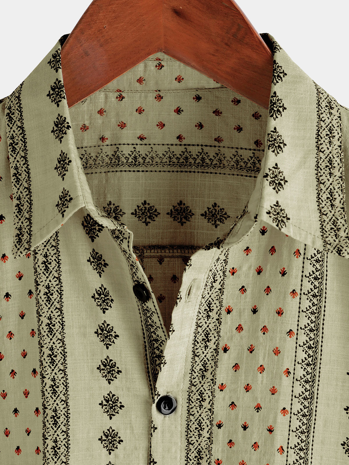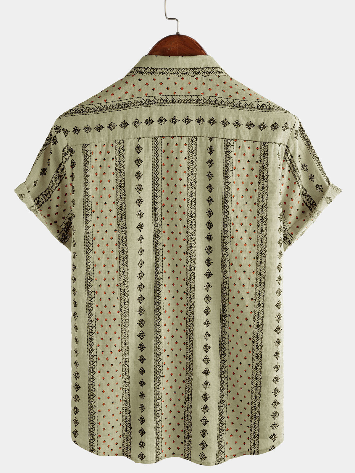 Herren Khakifarbenes Gestreiftes Retro-Kurzarmhemd